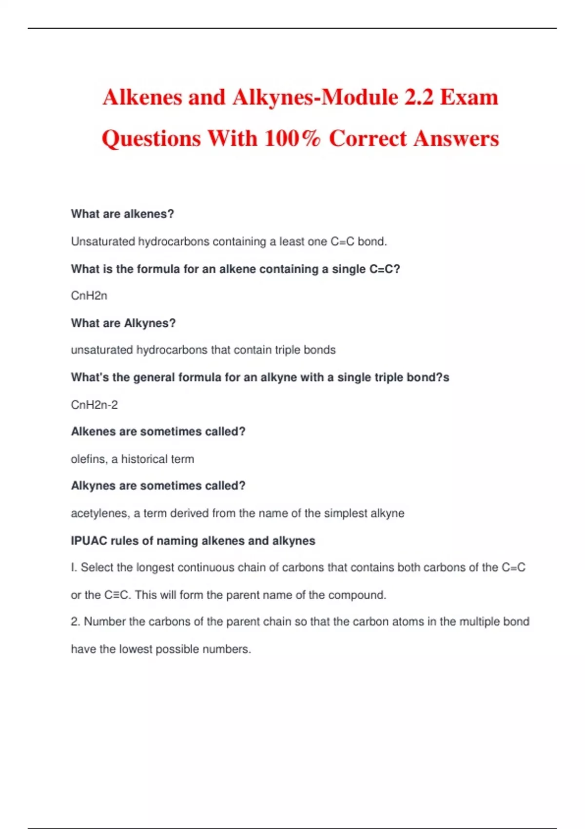 Alkenes and Alkynes-Module 2.2 Exam Questions With 100% Correct Answers What are alkenes? Unsaturated hydrocarbons containing a least one C=C bond. What is the formula for an alkene containing a single C=C? CnH2n What are Alkynes? unsaturated hydrocarbons that contain triple bonds What's the general formula for an alkyne with a single triple bond?s CnH2n-2 Alkenes are sometimes called? olefins, a historical term Alkynes are sometimes called? acetylenes, a term derived from the name of the simplest alkyne IPUAC rules of naming alkenes and alkynes I. Select the longest continuous chain of carbons that contains both carbons of the C=C or the C≡C. This will form the parent name of the compound. 2. Number the carbons of the parent chain so that the carbon atoms in the multiple bond have the lowest possible numbers.