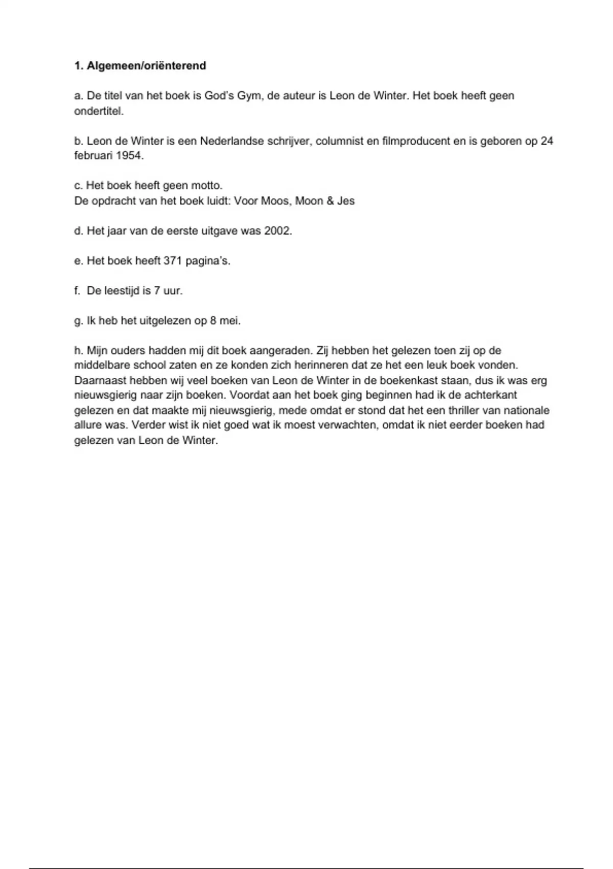 a. De titel van het boek is God’s Gym, de auteur is Leon de Winter. Het boek heeft geen