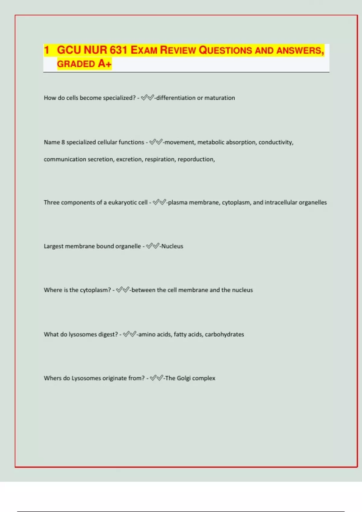 GCU NUR 631 EXAM REVIEW QUESTIONS AND ANSWERS, GRADED A+ How do cells become specialized? - -differentiation or maturation Name 8 specialized cellular functions - -movement, metabolic absorption, conductivity, communication secretion, excretion, respiration, reporduction, Three components of a eukaryotic cell - -plasma membrane, cytoplasm, and intracellular organelles Largest membrane bound organelle - -Nucleu
