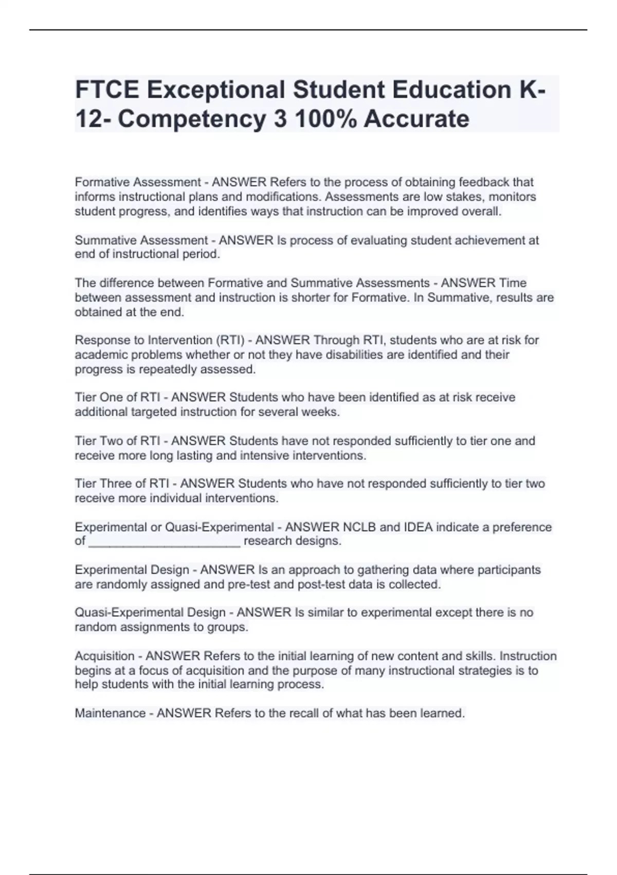 FTCE Exceptional Student Education K-12- Competency 3 100% Accurate