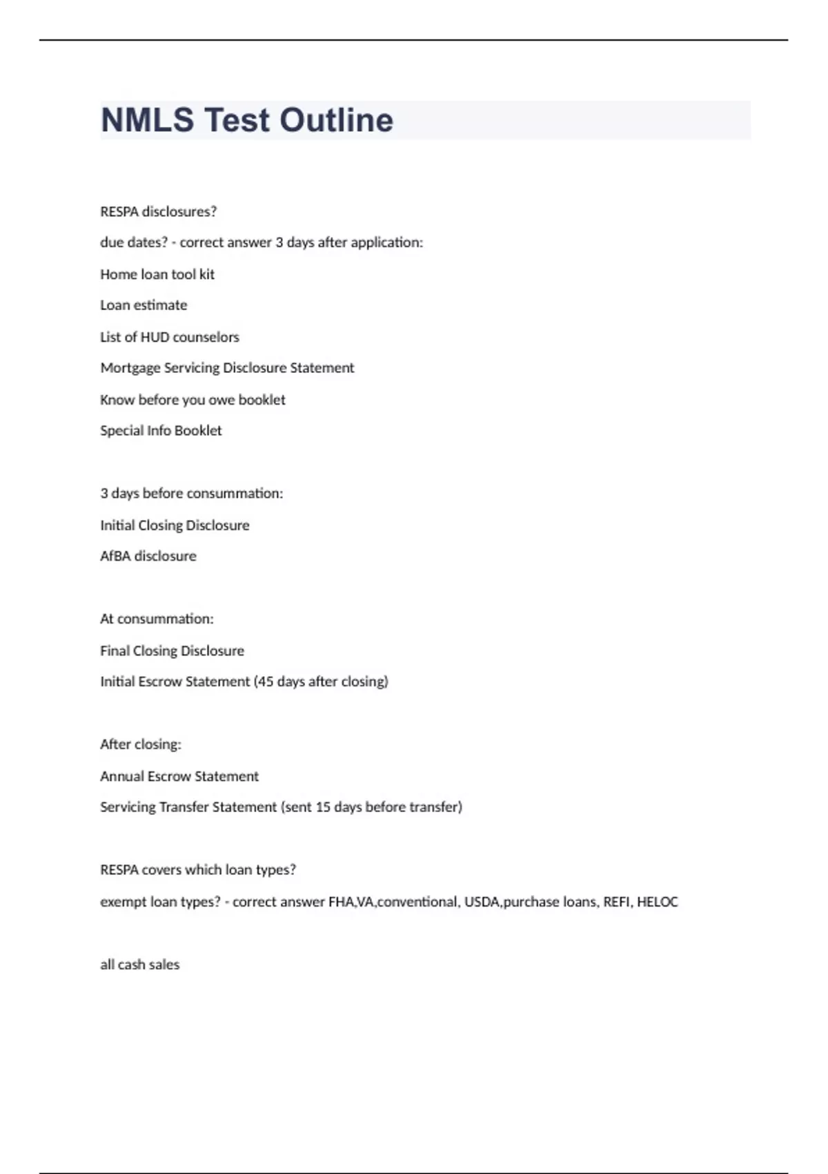 NMLS Test Outline Final Practice Questions 2024. RESPA disclosures? due dates? - correct answer 3 days after application: Home loan tool kit Loan estimate List of HUD counselors Mortgage Servicing Disclosure Statement Know before you owe booklet Special Info Booklet 3 days before consummation: Initial Closing Disclosure AfBA disclosure At consummation: Final Closing Disclosure Initial Escrow Statement (45 days after closing) After closing: Annual Escrow Statement Servicing Transfer Statement (sent 15 days before transfer) RESPA covers which loan types? exempt loan types? - correct answer FHA,VA,conventional, USDA,purchase loans, REFI, HELOC all cash sales