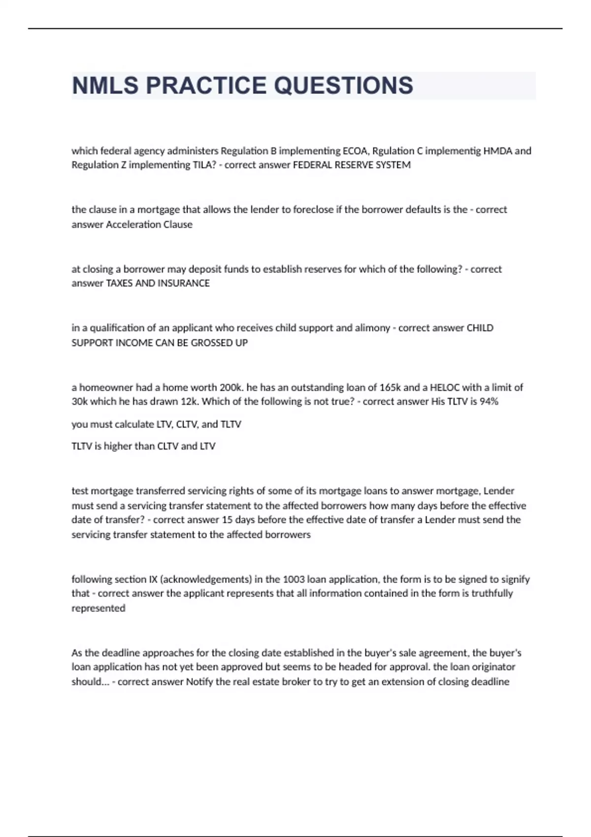 NMLS VERIFIED COMPLETE PRACTICE QUESTIONS 2024. which federal agency administers Regulation B implementing ECOA, Rgulation C implementig HMDA and Regulation Z implementing TILA? - correct answer FEDERAL RESERVE SYSTEM the clause in a mortgage that allows the lender to foreclose if the borrower defaults is the - correct answer Acceleration Clause at closing a borrower may deposit funds to establish reserves for which of the following? - correct answer TAXES AND INSURANCE in a qualification of an applicant who receives child support and alimony - correct answer CHILD SUPPORT INCOME CAN BE GROSSED UP a homeowner had a home worth 200k. he has an outstanding loan of 165k and a HELOC with a limit of 30k which he has drawn 12k. Which of the following is not true? - correct answer His TLTV is 94% you must calculate LTV, CLTV, and TLTV TLTV is higher than CLTV and LTV test mortgage transferred servicing rights of some of its mortgage loans to answer mortgage, Lender must send a servicing transfer statement to the affected borrowers how many days before the effective date of transfer? - correct answer 15 days before the effective date of transfer a Lender must send the servicing transfer statement to the affected borrowers following section IX (acknowledgements) in the 1003 loan application, the form is to be signed to signify that - correct answer the applicant represents that all information contained in the form is truthfully represented As the deadline approaches for the closing date established in the buyer's sale agreement, the buyer's loan application has not yet been approved but seems to be headed for approval. the loan originator should... - correct answer Notify the real estate broker to try to get an extension of closing deadline