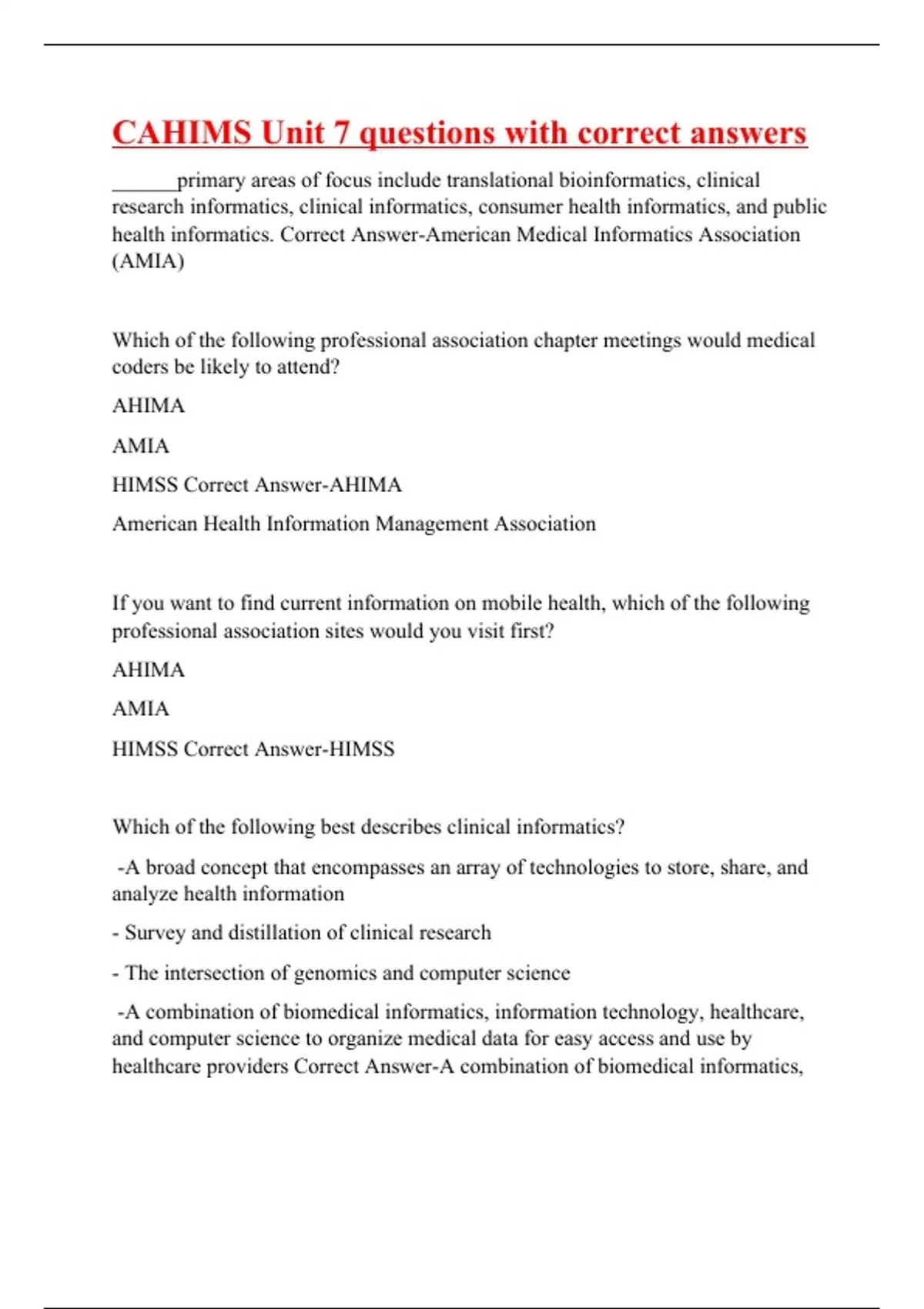 CAHIMS Unit 7 questions with correct answers ______primary areas of focus include translational bioinformatics, clinical research informatics, clinical informatics, consumer health informatics, and public health informatics. Correct Answer-American Medical Informatics Association (AMIA) Which of the following professional association chapter meetings would medical coders be likely to attend? AHIMA AMIA HIMSS Correct Answer-AHIMA American Health Information Management Association If you want to find current information on mobile health, which of the following professional association sites would you visit first? AHIMA AMIA HIMSS Correct Answer-HIMSS Which of the following best describes clinical informatics? -A broad concept that encompasses an array of technologies to store, share, and analyze health information - Survey and distillation of clinical research - The intersection of genomics and computer science -A combination of biomedical informatics, information technology, healthcare, and computer science to organize medical data for easy access and use by healthcare providers Correct Answer-A combination of biomedical informatics, information technology, healthcare, and computer science to organize medical data for easy access and use by healthcare providers Which of the following is not a benefit of telemedicine? Patients with conditions that require specialized care, whose region does not have these specialists, can receive care virtually.