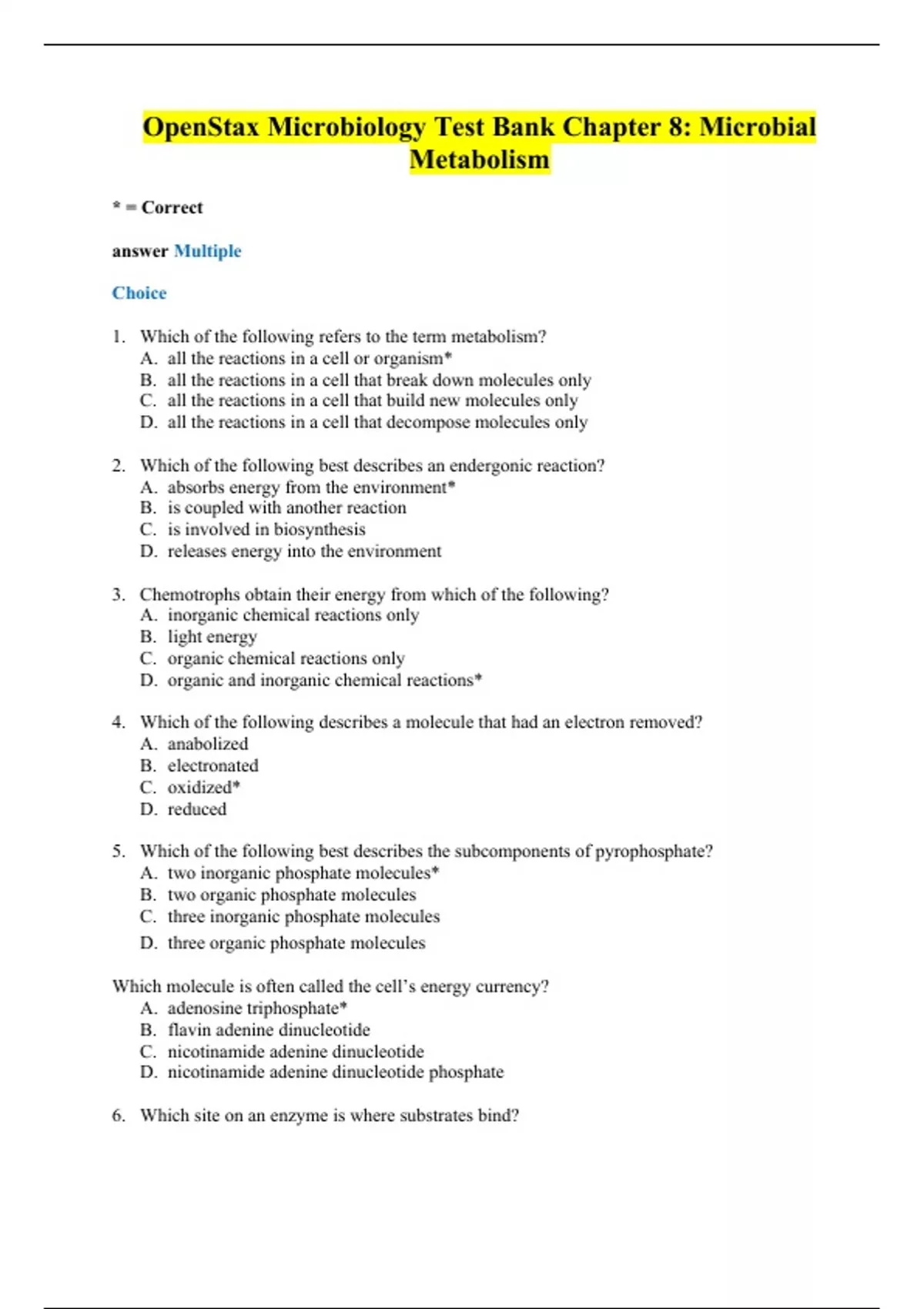 OpenStax Microbiology Test Bank Chapter 8: Microbial Metabolism * = Correct answer Multiple Choice 1.Which of the following refers to the term metabolism? A.all the reactions in a cell or organism* B.all the reactions in a cell that break down molecules only C.all the reactions in a cell that build new molecules only D.all the reactions in a cell that decompose molecules only 2.Which of the following best describes an endergonic reaction? A.absorbs energy from the environment* B.is coupled with another reaction C.is involved in biosynthesis D.releases energy into the environment 3.Chemotrophs obtain their energy from which of the following? A.inorganic chemical reactions only B.light energy C.organic chemical reactions only D.organic and inorganic chemical reactions* 4.Which of the following describes a molecule that had an electron removed? A.anabolized B.electronated C.oxidized* D.reduced 5.Which of the following best describes the subcomponents of pyrophosphate? A.two inorganic phosphate molecules* B.two organic phosphate molecules C.three inorganic phosphate molecules D.three organic phosphate molecules Which molecule is often called the cell’s energy currency? A.adenosine triphosphate* B.flavin adenine dinucleotide C.nicotinamide adenine dinucleotide D.nicotinamide adenine dinucleotide phosphate 6.Which site on an enzyme is where substrates bind? A.the activation site B.the active site* C.the catalyst site D.the lock and key site 7.Which of the following are inorganic molecules that bind to enzymes? A.apoenzymes B.coenzymes C.cofactors* D.holoenzymes 8.Which of the following best describes catabolic pathways? A.They always absorb energy. B.They break down large molecules into smaller components.* C.They build up large molecules from smaller components. D.They must be coupled with the breakdown of ATP. 9.Which group comprises all lithotrophs? A.algae B.autotrophs C.microbes* D.plants 10.Which is a common electron acceptor in catabolic reactions? A.ATP B.FADH2 C.NAD+* D.NADPH 11.The reaction that breaks down ATP to form ADP and inorganic phosphate is classified as which of the following? A.endergonic B.exergonic* C.nonspontaneous D.reduction 12.Which of the following is an inhibitor that binds to the active site of an enzyme? A.a competitive inhibitor* B.a noncompetitive inhibitor C.an allosteric inhibitor D.an uncompetitive inhibitor 13.Glycolysis produces a net gain of which of the following? A.two ATP, two NADH, and two pyruvates* B.two ATP, two NADH, and four pyruvates C.two ATP, four NADH, and two pyruvates D.four ATP, two NADH, and two pyruvates 14.Which of the following is a pathway that breaks down glucose in some microbes? A.the Calvin cycle B.the Entner-Doudoroff pathway* C.the Krebs cycle D.the tricarboxylic acid cycle 15.Which of the following best describes a transition reaction? A.a reaction that converts pyruvate to acetyl CoA with the release of carbon dioxide* B.a series of reactions that convert citric acid to oxaloacetate C.an optional reaction that transports pyruvate into the mitochondrion D.the reaction that converts glucose to glucose-6-phosphate in glycolysis 16.Which of the following is not a product of the Krebs cycle? A.carbon dioxide B.GTP, which is converted to ATP C.NADH D.pyruvate* 17.The Krebs cycle begins with the addition of acetyl CoA to which of the following? A.citric acid B.oxaloacetate* C.ribulose bisphosphate D.succinate dehydrogenase 18.Which of the following is the step in which CO2 enters the light-independent reactions (Calvin cycle)? A.fixation* B.reduction C.regeneration D.transition 19.Carotenoids are pigments that are which of the following colors? A.blue/green B.green/orange C.orange/yellow/red* D.purple/blue 20.Which of the following are enzymes that break down proteins? A.amylases B.oxidases C.oxygenases D.proteases* 21.Fatty acids are often degraded using which set of reactions? A.β-oxidation* B.glycolysis C.photophosphorylation D.the tricarboxylic acid cycle