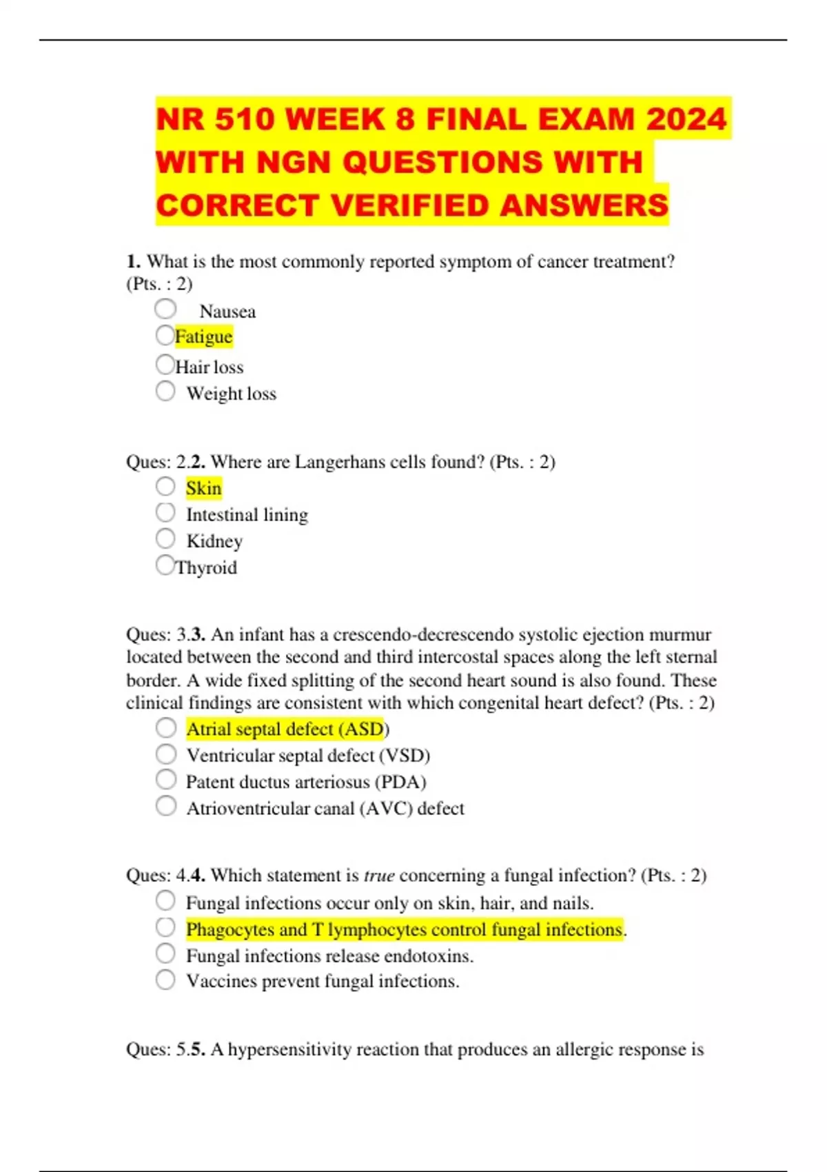 NR 510 WEEK 8 FINAL EXAM 2024 WITH NGN QUESTIONS WITH CORRECT VERIFIED ANSWERS 1. What is the most commonly reported symptom of cancer treatment? (Pts. : 2) Nausea Fatigue Hair loss Weight loss Ques: 2.2. Where are Langerhans cells found? (Pts. : 2) Skin Intestinal lining Kidney Thyroid Ques: 3.3. An infant has a crescendo-decrescendo systolic ejection murmur located between the second and third intercostal spaces along the left sternal border. A wide fixed splitting of the second heart sound is also found. These clinical findings are consistent with which congenital heart defect? (Pts. : 2) Atrial septal defect (ASD) Ventricular septal defect (VSD) Patent ductus arteriosus (PDA) Atrioventricular canal (AVC) defect Ques: 4.4. Which statement is true concerning a fungal infection? (Pts. : 2) Fungal infections occur only on skin, hair, and nails. Phagocytes and T lymphocytes control fungal infections. Fungal infections release endotoxins. Vaccines prevent fungal infections. Ques: 5.5. A hypersensitivity reaction that produces an allergic response is called: (Pts. : 2) Hemolytic shock Anaphylaxis Necrotizing vasculitis Systemic erythematosus Ques: 6.6. What period follows depolarization of the myocardium and represents a period during which no new cardiac potential can be propagated? (Pts. : 2) Refractory Hyperpolarization Threshold Sinoatrial (SA) Ques: 7.7. Which renal change is found in older adults? (Pts. : 2) Sharp decline in glomerular filtration rate Sharp decline in renal blood flow Decrease in the number of nephrons Decrease in urine output Ques: 8.8. Cystic fibrosis is caused by which process? (Pts. : 2) Autosomal recessive inheritance Autosomal dominant inheritance Infection Malignancy Ques: 9.9. What is the most common predisposing factor to obstructive sleep apnea in children? (Pts. : 2) Chronic respiratory infections Adenotonsillar hypertrophy Obligatory mouth breathing Paradoxic breathing