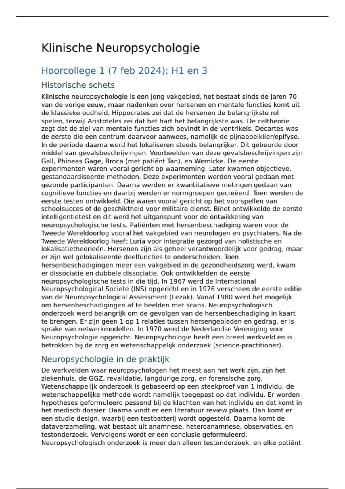 Samenvatting van alle hoorcolleges van klinische neuropsychologie