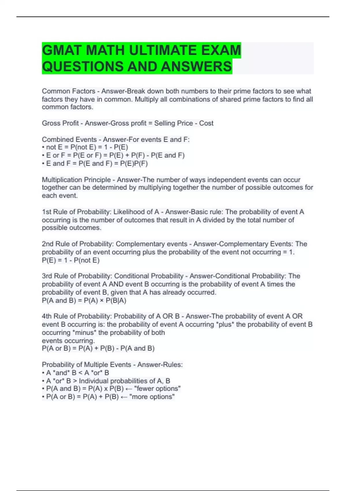 GMAT MATH ULTIMATE EXAM QUESTIONS AND ANSWERS Consecutive Integers - Answer-Even: 2n, 2n + 2, 2n + 4 Odd: 2n + 1, 2n + 3, 2n + 5 Properties of Zero - Answer-Zero is an even integer. Zero is neither positive nor negative. Zero is a multiple of every number. Zero is a factor of no number. FOIL Method with Quadratics with Roots - Answer-Use FOIL Method with Quadratics with Roots n − 4√n + 4 = (√n − 2) (√n − 2) = x2 − 4x + 4 Similar Triangle Areas - Answer-The ratio of the areas of two similar triangles is the *square* of the ratio of corresponding lengths. Triangle ABC has sides AB = 2 and AC = 4. Each side of triangle DEF is 2 times the length of corresponding triangle ABC (DE = 4, DF = 8) Triangle DEF must have 2x2, or 4, times the area of triangle ABC. Exterior Angles in Triangles - Answer-Exterior angle d is equal to the sum of the two remote interior angles a and b. d = a + b Gross vs. Net - Answer-Gross is the total amount before any deductions are made. Net is the amount after deductions are made. Useful Percentages to Know - Answer-1/8 = 12.5% 1/6 = 16.6% 2/3 = 66.6% 5/6 = 83.3% Odds and Evens - Answer-Odd + Odd = Even Even + Even = Even Odd + Even = Odd Odd × Odd = Odd Even × Even = Even Odd × Even = Even Simplify the Base of Exponential Expression - Answer-Always try to simplify the base