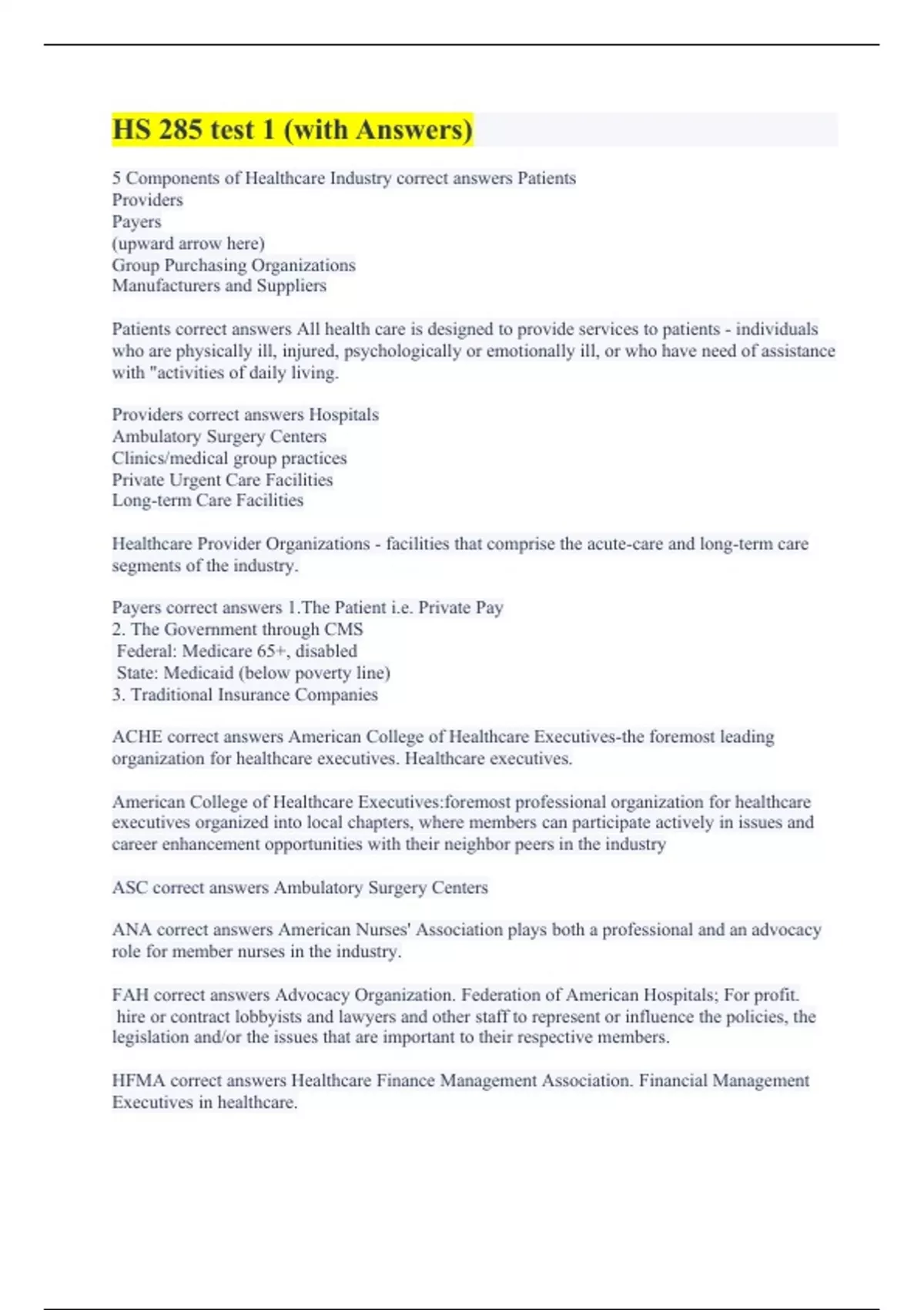 5 Components of Healthcare Industry correct answers Patients Providers Payers (upward arrow here) Group Purchasing Organizations Manufacturers and Suppliers Patients correct answers All health care is designed to provide services to patients - individuals who are physically ill, injured, psychologically or emotionally ill, or who have need of assistance with "activities of daily living. Providers correct answers Hospitals Ambulatory Surgery Centers Clinics/medical group practices Private Urgent Care Facilities Long-term Care Facilities Healthcare Provider Organizations - facilities that comprise the acute-care and long-term care segments of the industry. Payers correct answers 1.The Patient i.e. Private Pay 2. The Government through CMS Federal: Medicare 65+, disabled State: Medicaid (below poverty line) 3. Traditional Insurance Companies ACHE correct answers American College of Healthcare Executives-the foremost leading organization for healthcare executives. Healthcare executives. American College of Healthcare Executives:foremost professional organization for healthcare executives organized into local chapters, where members can participate actively in issues and career enhancement opportunities with their neighbor peers in the industry ASC correct answers Ambulatory Surgery Centers ANA correct answers American Nurses' Association plays both a professional and an advocacy role for member nurses in the industry. FAH correct answers Advocacy Organization. Federation of American Hospitals; For profit. hire or contract lobbyists and lawyers and other staff to represent or influence the policies, the legislation and/or the issues that are important to their respective members. HFMA correct answers Healthcare Finance Management Association. Financial Management Executives in healthcare.