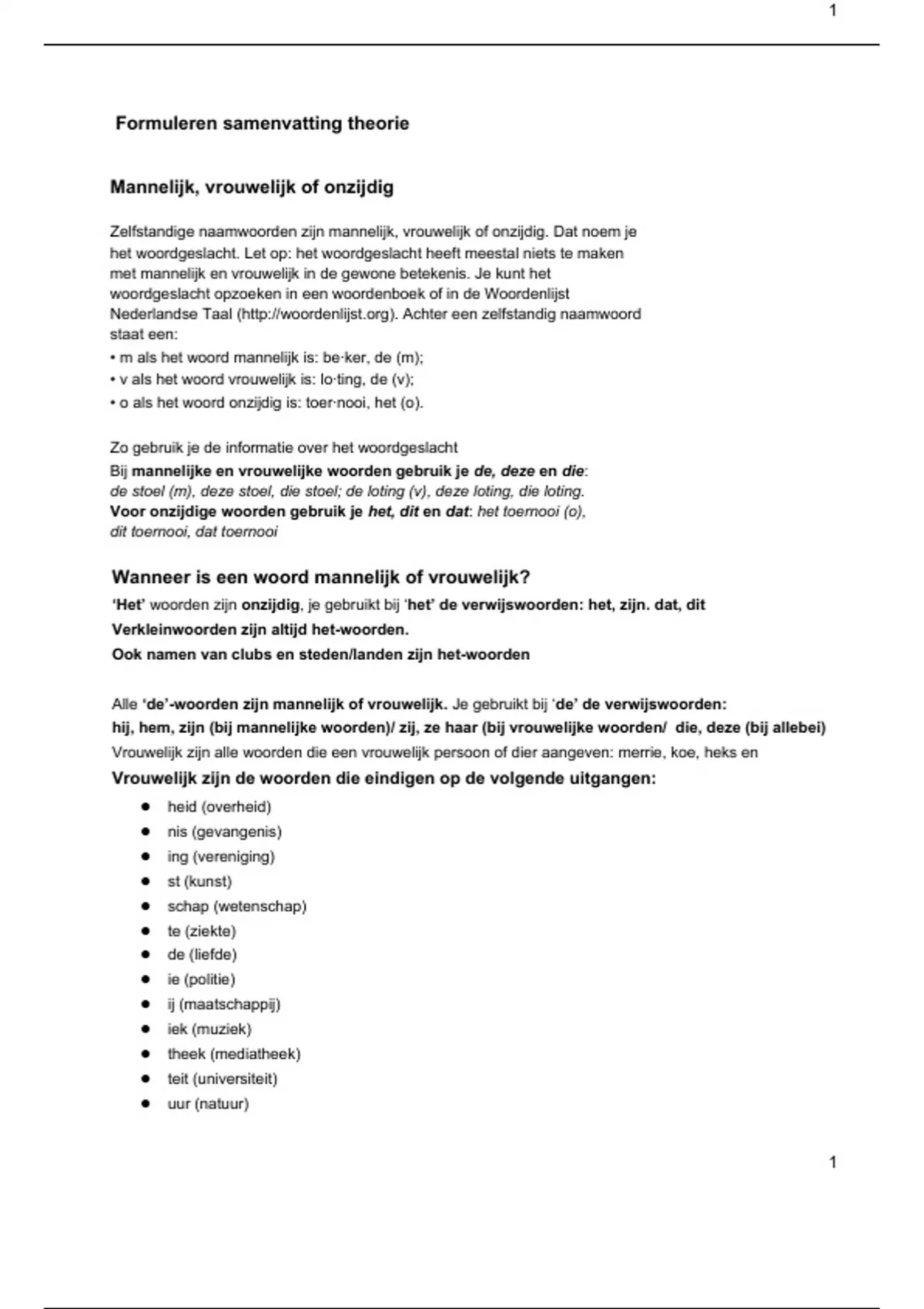 Vrouwelijk zijn de woorden die eindigen op de volgende uitgangen: