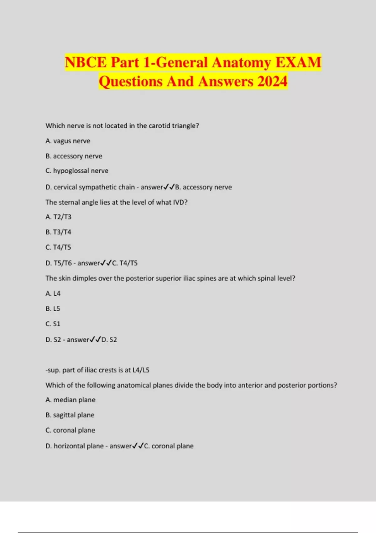 NBCE Part 1-General Anatomy EXAM Questions And Answers 2024 Which nerve is not located in the carotid triangle? A. vagus nerve B. accessory nerve C. hypoglossal nerve D. cervical sympathetic chain - answerB. accessory nerve The sternal angle lies at the level of what IVD? A. T2/T3 B. T3/T4 C. T4/T5 D. T5/T6 - answerC. T4/T5 The skin dimples over the posterior superior iliac spines are at which spinal level? A. L4 B. L5 C. S1 D. S2 - answerD. S2 -sup. part of iliac crests is at L4/L5 Which of the following anatomical planes divide the body into anterior and posterior portions? A. median plane B. sagittal plane C. coronal plane D. horizontal plane - answerC. coronal plane Which of the following layers of the epidermis is responsible for the constant renewal of epidermal cells? A. stratum germinativum B. stratum granulosum C. stratum lucidum D. stratum corneum - answerA. stratum germinativum The transverse thoracic plane separates which 2 regions of the mediastinum? A. anterior from the middle B. middle from the posterior C. anterior from the posterior D. superior from the inferior - answerD. superior from the inferior Which plane would indicate the origin of the inferior vena cava? A. transumbilical plane B. subcostal plane C. transtubercular plane D. transpyloric plane - answerC. transtubercular plane Which plane would indicate the termination of the abdominal aorta? A. supracristal or intercristal plane B. transtubercular plane C. transumbilical plane D. subcostal plane - answerA. supracristal or intercristal plane Your patient had a laceration anterior to the medial malleolus, which required stitches. He is now in your office complaining of pain along the medial border of the foot. Which nerve is most likely involved? A. sural nerve B. deep fibular C. tibial nerve D. saphenous nerve - answerD. saphenous nerve When the upper limb is in anatomical position, the medial end of the scapular spine is at which vertebral level? A. spinous process of second thoracic vertebra B. spinous process of third thoracic vertebra C. body of the third thoracic vertebra D. spinous process of fourth thoracic vertebra - answerB. spinous process of third thoracic vertebra While examining a patient, you notice that the right scapula is farther from the midline than the left. You would suspect paralysis of which muscles? A. rhomboid major and minor B. latissimus dorsi C. supraspinatus D. deltoid - answerA. rhomboid major and minor Which of the following movements occur within the frontal plane? A. flexion of the leg B. abduction of the thigh C. pronation of the forearm D. medial rotation of the arm - answerB. abduction of the thigh Which anatomical plane divides the body into superior and inferior parts? A. sagittal plane B. frontal plane C. transverse plane D. coronal plane - answerC. transverse plane The coracoid process is a feature of which bone? A. scapula B. ulna C. clavicle D. humerus - answerA. scapula