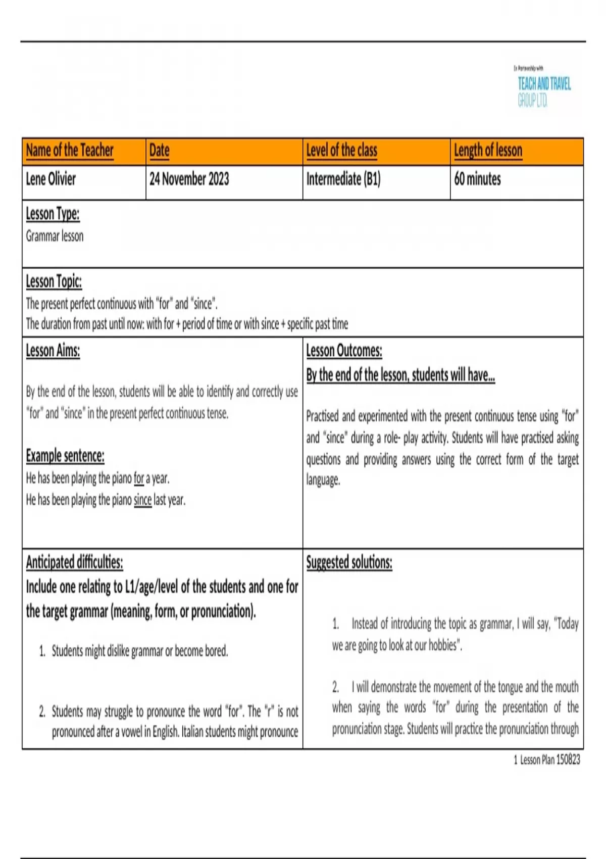 The assignment passed with good feedback. Lesson Topic: The present perfect continuous with “for” and “since”.