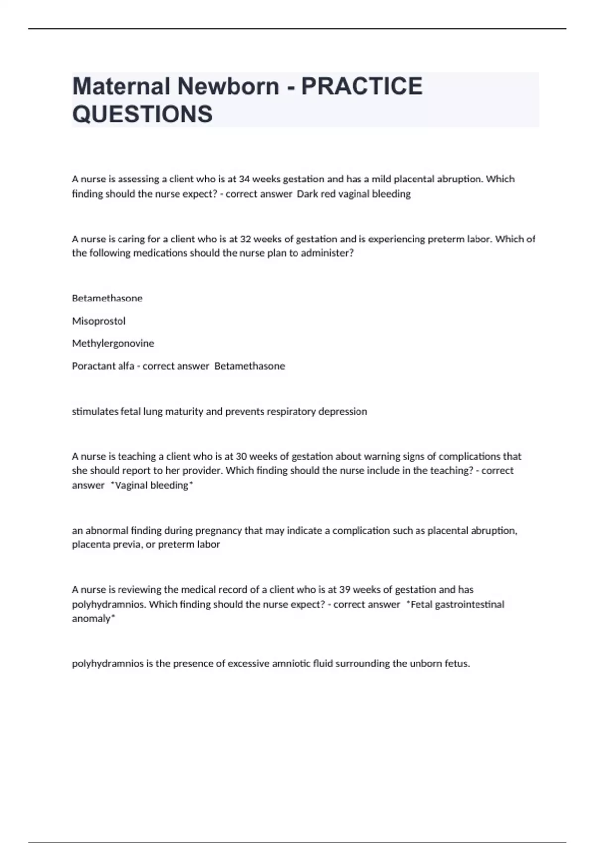 Maternal Newborn - PRACTICE QUESTIONSA nurse is assessing a client who is at 34 weeks gestation and has a mild placental abruption. Which finding should the nurse expect? - correct answer Dark red vaginal bleeding A nurse is caring for a client who is at 32 weeks of gestation and is experiencing preterm labor. Which of the following medications should the nurse plan to administer? Betamethasone Misoprostol Methylergonovine Poractant alfa - correct answer Betamethasone stimulates fetal lung maturity and prevents respiratory depression A nurse is teaching a client who is at 30 weeks of gestation about warning signs of complications that she should report to her provider. Which finding should the nurse include in the teaching? - correct answer *Vaginal bleeding* an abnormal finding during pregnancy that may indicate a complication such as placental abruption, placenta previa, or preterm labor A nurse is reviewing the medical record of a client who is at 39 weeks of gestation and has polyhydramnios. Which finding should the nurse expect? - correct answer *Fetal gastrointestinal anomaly* polyhydramnios is the presence of excessive amniotic fluid surrounding the unborn fetus. gastrointestinal malformations and neurologic disorders are expected findings for a fetus experiencing the effects of polyhydramnios A nurse is teaching a client who has pre-eclampsia and is to receive magnesium sulfate via continuous IV infusion about expected adverse effects. Which adverse effect should the nurse include in the teaching? - correct answer Feeling of warmth A nurse is assessing a client who is at 35 weeks of gestation and has mild gestational hypertension. Which finding should the nurse identify as priority? - correct answer Low urine output (<30mL per hour) when using the urgent vs. nonurgent approach to client care, the nurse should determine that the priority finding is 480 mL of urine output in 24 hr because the minimum acceptable urine output in an adult client is 30 mL/hr. This can indicate progression of hypertension, which requires immediate intervention. Therefore, this is the priority finding. A nurse is teaching a client who is at 12 weeks of gestation about the manifestations of potential complications that she should report to her provider. Which information should the nurse include in the teaching? - correct answer Swelling of the face indicative of a hypertensive disorder or preeclampsia A nurse is reviewing lab results for a client who is at 37 weeks of gestation. The nurse notes that the client is rubella non-immune, positive for group A beta-hemolytic strep, and has a blood type of O negative. Which action should the nurse take? - correct answer Instruct the client to obtain a rubella immunization after delivery A nurse is caring for a client who has oligohydramnios. Which fetal anomaly should the nurse expect? - correct answer *Renal agenesis* oligohydramnios is a volume of amniotic fluid less than 300 mL during the third trimester of pregnancy occurs when there is a renal system dysfunction or obstructive uropathy