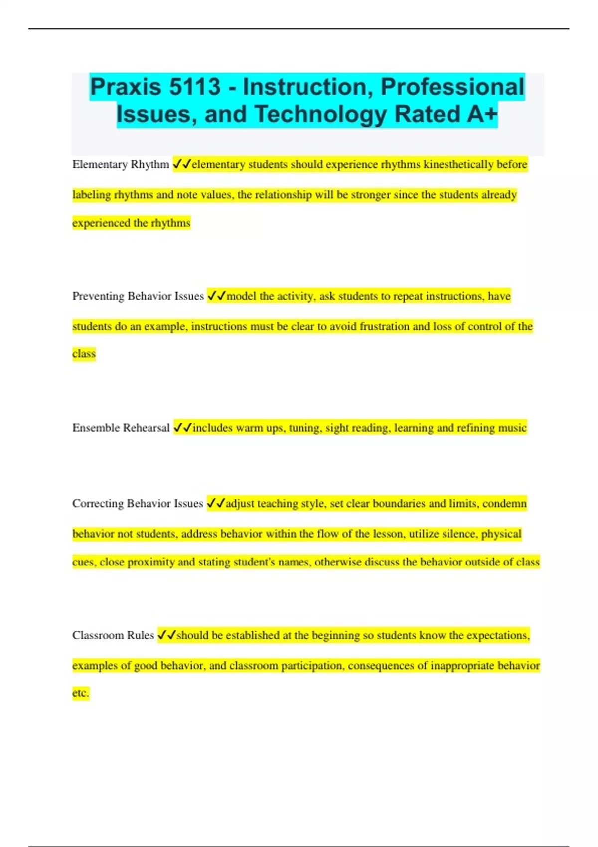 Praxis 5113 - Instruction, Professional Issues, and Technology Rated A+ Elementary Rhythm elementary students should experience rhythms kinesthetically before labeling rhythms and note values, the relationship will be stronger since the students already experienced the rhythms Preventing Behavior Issues model the activity, ask students to repeat instructions, have students do an example, instructions must be clear to avoid frustration and loss of control of the class Ensemble Rehearsal includes warm ups, tuning, sight reading, learning and refining music Correcting Behavior Issues adjust teaching style, set clear boundaries and limits, condemn behavior not students, address behavior within the flow of the lesson, utilize silence, physical cues, close proximity and stating student's names, otherwise discuss the behavior outside of class Classroom Rules should be established at the beginning so students know the expectations, examples of good behavior, and classroom participation, consequences of inappropriate behavior etc. Every Pupil Responds Instructional Technique -ensures student inclusion during a lesson -allows the teacher to quickly and efficiently check for understanding Classroom Routines -important for structure and organization -can prevent misbehavior -lessons will have less interruption -include how to enter the classroom, beginning work, roll, announcements, tardies, absences, teachers attention signal, leaving your seat, assignments, supplies, group work, and independent work Intrinsic Motivation A desire to perform a behavior for its own sake, this motivation is effective for students who already have a natural tendency for the task at hand Extrinsic Motivation a motivation to take actions that lead to reward, examples include grades, privileges, peer esteem Aural Learners Like to hear and discuss things and concepts, need to question and talk through ideas, listen for their mistakes to learn from them Visual Learners learn best by seeing educational content, visual explanations and aids, projectors, handouts, videos, Kinesthetic Learners learn best by doing, movement while learning, demonstration of techniques Students with Physical Disabilities classroom should be ADA accessible, free from obstacles, adaptive instruments, create lessons that require minimal physical strength Students with Visual Impairments ample time for student to physical explore instruments, Braille Music code for lessons, place hand under students hands to demonstrate Students with Dyslexia enlargement of notation, color coding, multi-sensory approaches, visual and aural demonstration of rhythm, visual and tactile demonstrations of notation, technology, pattern learning, and graphics within notation Assessment individual and ensemble achievement, performance of scales or musical excerpts, pitch matching, rhythm matching, historical or contextual knowledge of music, analysis and evaluation of music Feedback informal assessments, informal questioning and discussion, short pop quizzes allows for more learning opportunities for the students Care for Woodwinds keep dry, wipe clean of fingerprints, apply key oil monthly, clean out the mouth piece between eating and playing and then weekly, check for damages and keep out of direct light and extreme temperatures Care of Stringed Instruments avoid handling the varnish, remove oil and rosin dust after playing, keep out of direct light and extreme temperatures Care of Brass Instruments Wipe away with oil and dirt with a soft cloth, use a swab to remove moisture from within, apply small amount of valve oil after playing each session, clean and lubricate slides, keep in a cool environment Care of Percussion Instruments even and smooth