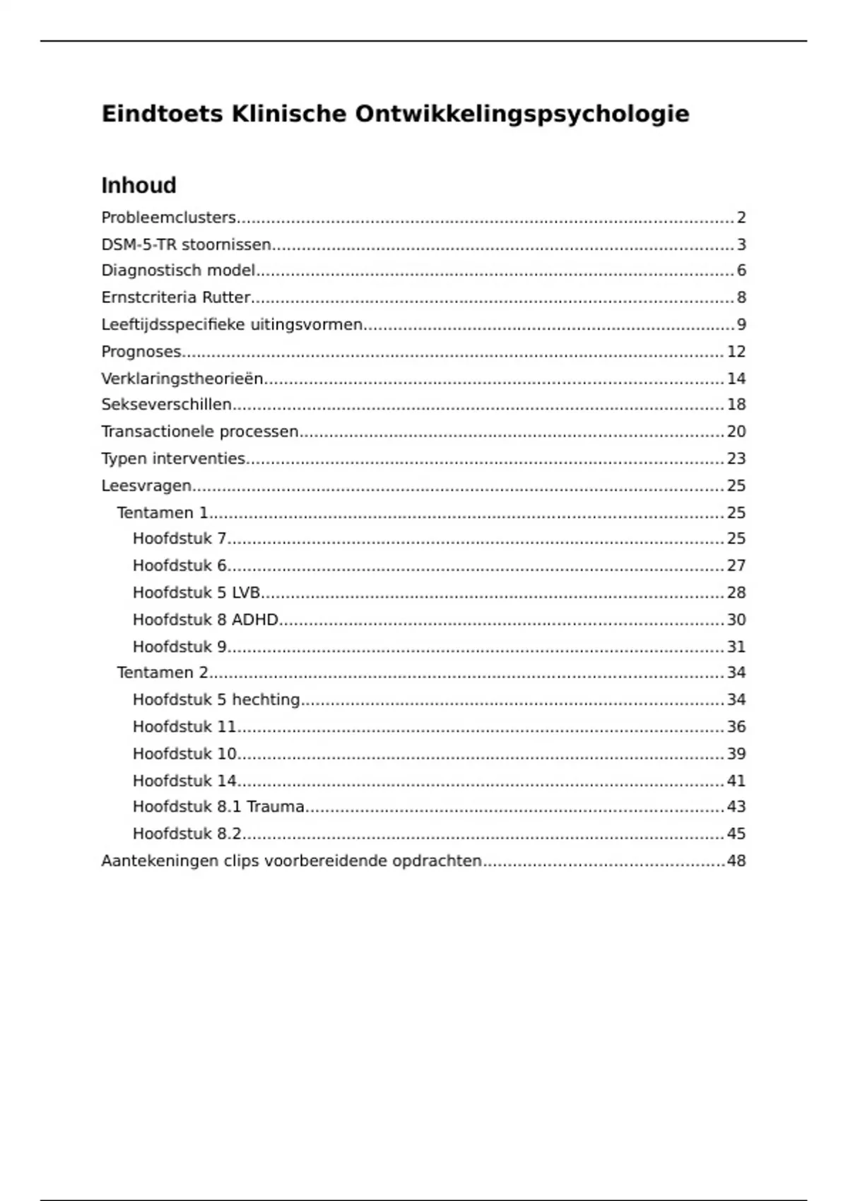Dit document bevat een samenvatting van de benodigde stof voor het eindtentamen van Klinische Ontwikkelingspsychologie. De volgende onderwerpen komen aan bod: probleemclusters, DSM stoornissen, diagnostisch model, ernstcriteria Rutter, leeftijdsspecifieke uitingsvormen, prognoses, verklaringstheorieën, voorbeelden van transactionele processen, soorten interventies en alle leesvragen van zowel deeltentamen 1 als deeltentamen 2 (bij hoofdstuk 7 missen er twee leesvragen).