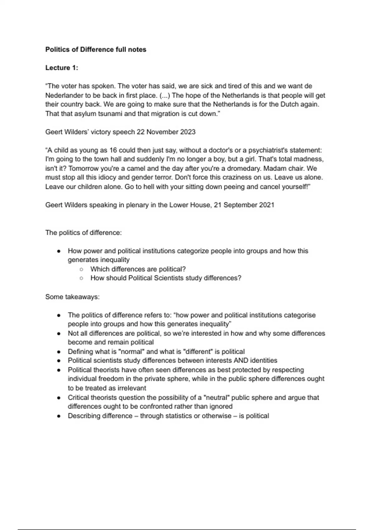This summary contains notes from all the lectures the University of Amsterdam gave for its Politics of Difference course. Description given by the University: This is the last compulsory component of the BSc program in Political Science. The course aims to introduce students to concepts and theories that will help them understand the politics of difference. The politics of difference refers to how power and political institutions categorize people into groups and how this generates inequality. This form of politics has figured prominently on public and political agendas in recent years as reflected in movements like Blacklivesmatter and Metoo. This course seeks to give students the tools to both understand these developments and critically think about their relationship to them. The course connects different perspectives on social inequality and difference, notably normative perspectives on justice, social scientific concepts on the production and reproduction of inequalities, and political science perspectives on the intersections between inequalities and politics. Against the background of this conceptual agenda we explore a broad variety of manifestations of difference and how they ‘intersectionally’ relate to one another.