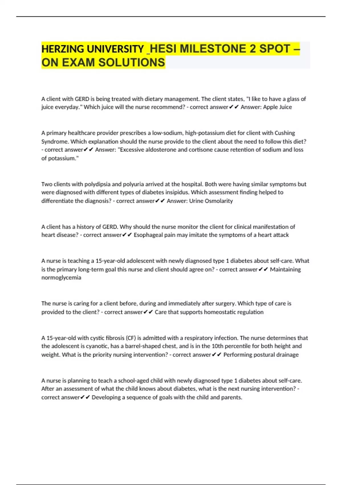 HERZING UNIVERSITY HESI MILESTONE 2 SPOT –ON EXAM SOLUTIONS