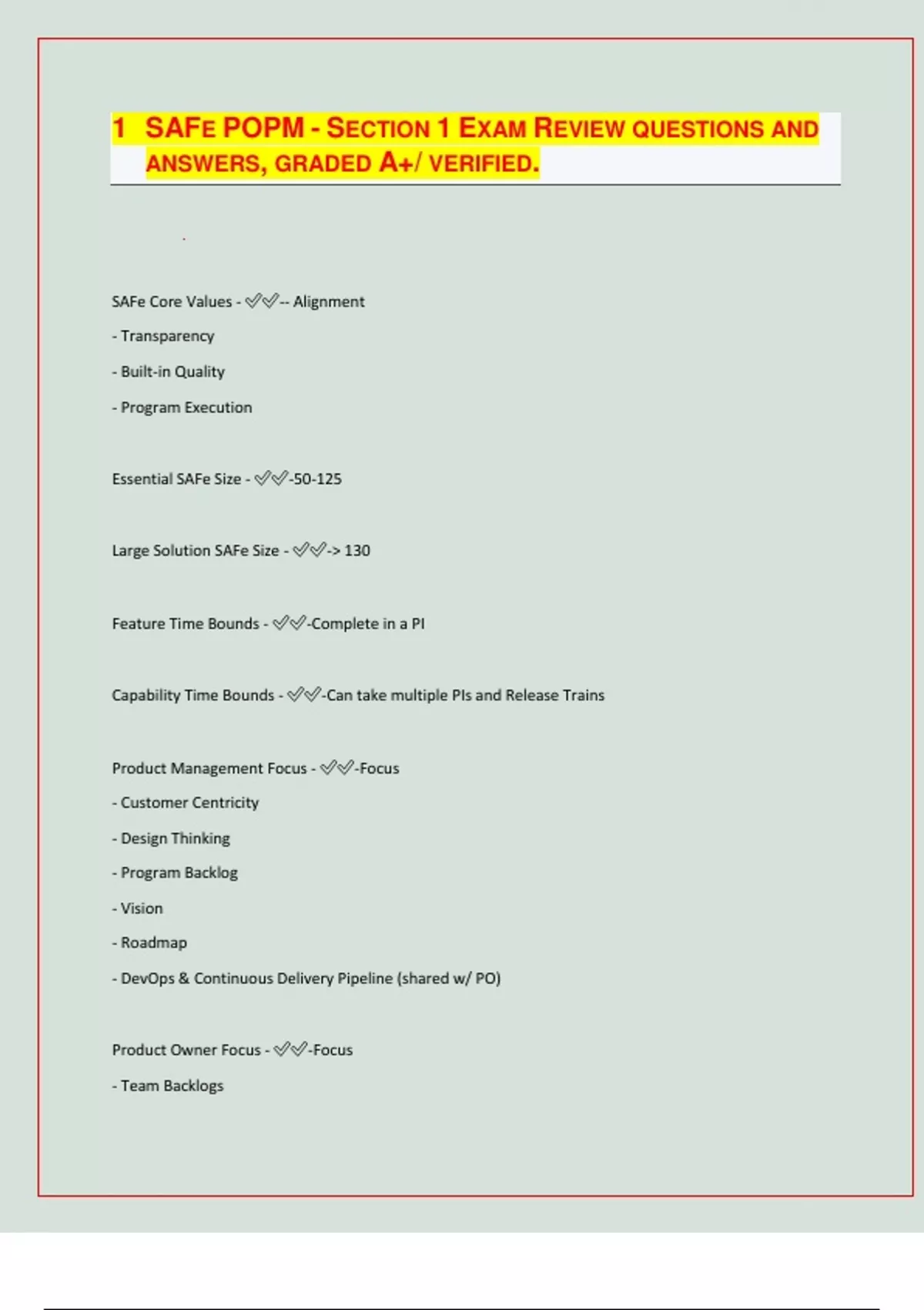SAFE POPM - SECTION 1 EXAM REVIEW QUESTIONS AND ANSWERS, GRADED A+/ VERIFIED. SAFe Core Values - -- Alignment - Transparency - Built-in Quality - Program Execution Essential SAFe Size - -50-125 Large Solution SAFe Size - -> 130 Feature Time Bounds - -Complete in a PI Capability Time Bounds - -Can take multiple PIs and Release Trains Product Management Focus - -Focus - Customer Centricity - Design Thinking - Program Backlog - Vision - Roadmap - DevOps & Continuous Delivery Pipeline (shared w/ PO) Product Owner Focus - -Focus - Team Backlogs - Scrum or Kanban Iterations - Develop on Cadence, Release on Demand - DevOps & Continuous Delivery Pipeline (shared w/ PM) - Supports PM w/ Vision & Roadmap Value Stream - -Represent the series of steps that an organization uses to implement Solutions that provide a continuous flow of value to a customer. - Are used to define and realize portfolio-level business objectives and organize Agile Teams to deliver value more rapidly - Contain the systems, the people who do the work, and the flow of information and materials Operational Value Streams - -Contains the steps and the people who *deliver* end-user value using the business solutions created by the Development Value Streams Development Value Streams - -Contains the steps and the people who *develop* the business Solutions created by the Operational Value Streams Solution - -Products, services, or systems delivered to the customer, whether internal or external to the Enterprise. - May be a product, product line, set of systems or a service that enables an Operational Value Stream - Produced by a Value Stream House of Lean - -- Goal: Value - Foundation: Leadership - Pillars: Respect for People and Culture, Flow, Innovation, Relentless Improvement Agile Manifesto - -- Individuals and interactions over processes and tools - Working software over comprehensive documentation - Customer collaboration over contract negotiation - Responding to change over following a plan SAFe Lean-Agile Principles - -1. Take an economic view 2. Apply systems thinking 3. Assume variability; preserve option
