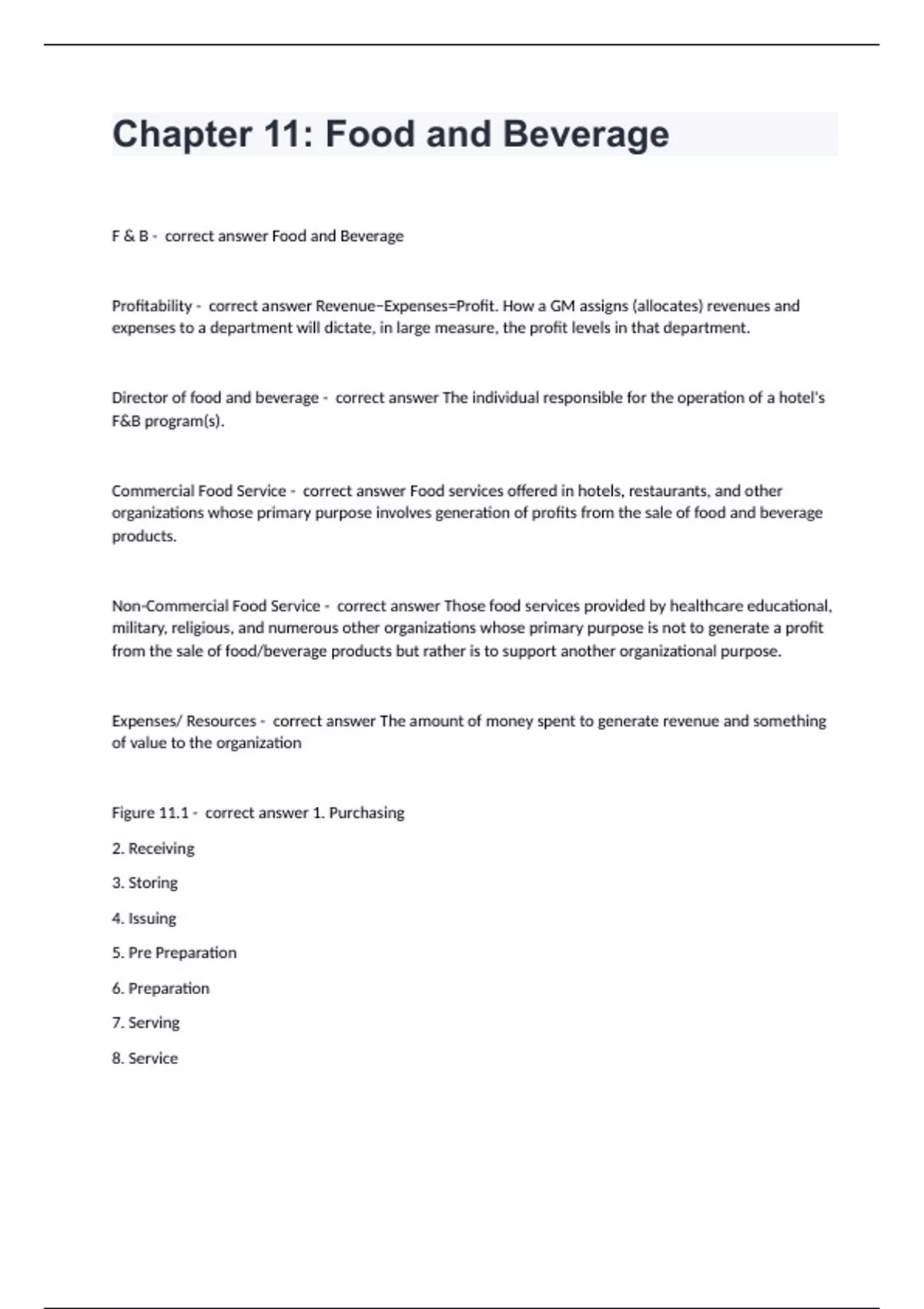 Chapter 11 Food and Beverage Questions with complete solution 2024 F & B - correct answer Food and Beverage Profitability - correct answer Revenue−Expenses=Profit. How a GM assigns (allocates) revenues and expenses to a department will dictate, in large measure, the profit levels in that department. Director of food and beverage - correct answer The individual responsible for the operation of a hotel's F&B program(s). Commercial Food Service - correct answer Food services offered in hotels, restaurants, and other organizations whose primary purpose involves generation of profits from the sale of food and beverage products. Non-Commercial Food Service - correct answer Those food services provided by healthcare educational, military, religious, and numerous other organizations whose primary purpose is not to generate a profit from the sale of food/beverage products but rather is to support another organizational purpose. Expenses/ Resources - correct answer The amount of money spent to generate revenue and something of value to the organization Figure 11.1 - correct answer 1. Purchasing 2. Receiving 3. Storing 4. Issuing 5. Pre Preparation 6. Preparation 7. Serving 8. Service