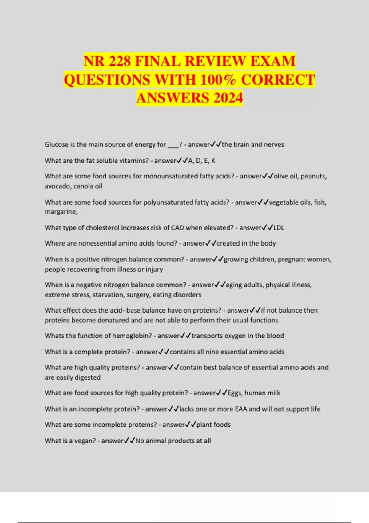 NR 228 FINAL REVIEW EXAM QUESTIONS WITH 100% CORRECT ANSWERS 2024 Glucose is the main source of energy for ___? - answerthe brain and nerves What are the fat soluble vitamins? - answerA, D, E, K What are some food sources for monounsaturated fatty acids? - answerolive oil, peanuts, avocado, canola oil What are some food sources for polyunsaturated fatty acids? - answervegetable oils, fish, margarine, What type of cholesterol increases risk of CAD when elevated? - answerLDL Where are nonessential amino acids found? - answercreated in the body When is a positive nitrogen balance common? - answergrowing children, pregnant women, people recovering from illness or injury When is a negative nitrogen balance common? - answeraging adults, physical illness, extreme stress, starvation, surgery, eating disorders What effect does the acid- base balance have on proteins? - answerif not balance then proteins become denatured and are not able to perform their usual functions Whats the function of hemoglobin? - answertransports oxygen in the blood What is a complete protein? - answercontains all nine essential amino acids What are high quality proteins? - answercontain best balance of essential amino acids and are easily digested What are food sources for high quality protein? - answerEggs, human milk What is an incomplete protein? - answerlacks one or more EAA and will not support life What are some incomplete proteins? - answerplant foods What is a vegan? - answerNo animal products at all