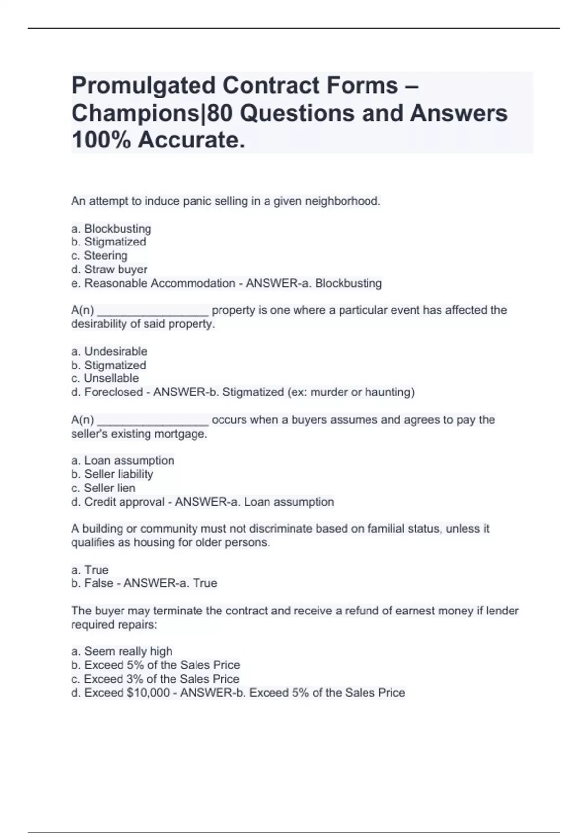 An attempt to induce panic selling in a given neighborhood. a. Blockbusting b. Stigmatized c. Steering d. Straw buyer e. Reasonable Accommodation - ANSWER-a. Blockbusting A(n) _________________ property is one where a particular event has affected the desirability of said property. a. Undesirable b. Stigmatized c. Unsellable d. Foreclosed - ANSWER-b. Stigmatized (ex: murder or haunting) A(n) _________________ occurs when a buyers assumes and agrees to pay the seller's existing mortgage. a. Loan assumption b. Seller liability c. Seller lien d. Credit approval - ANSWER-a. Loan assumption A building or community must not discriminate based on familial status, unless it qualifies as housing for older persons. a. True b. False - ANSWER-a. True The buyer may terminate the contract and receive a refund of earnest money if lender required repairs: a. Seem really high b. Exceed 5% of the Sales Price c. Exceed 3% of the Sales Price d. Exceed $10,000 - ANSWER-b. Exceed 5% of the Sales Price According to the Seller Financing Addendum, the interest rate is: a. Set at 6% b. Negotiated between the parties c. Set by TREC d. Determined at closing - ANSWER-b. Negotiated between the parties All written notices between the parties are effective when: a. Mailed b. Hand-delivered