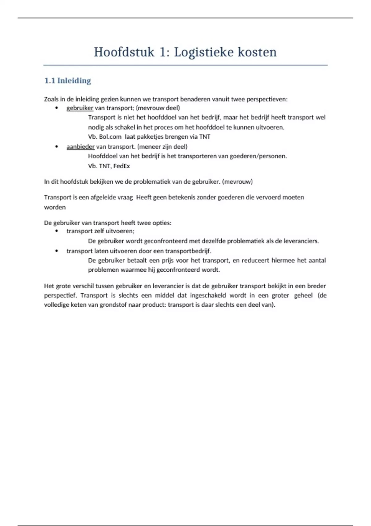 In dit document vind u een volledige samenvatting van het vak Logistiek en Transport. Het document bevat informatie over alle lessen voor het examen. Dit document alleen is meer dan genoeg om het vak met volle vertrouwen te halen.