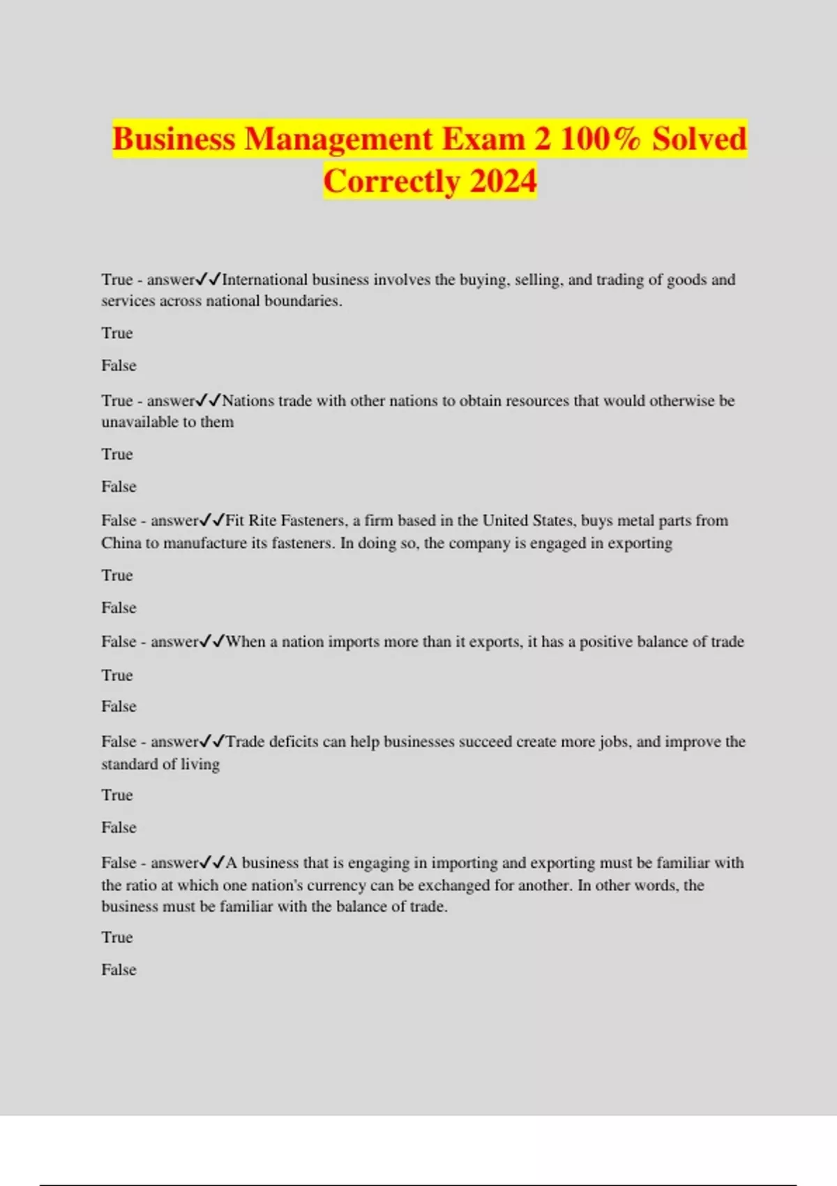 Business Management Exam 2 100% Solved Correctly 2024 True - answerInternational business involves the buying, selling, and trading of goods and services across national boundaries. True False True - answerNations trade with other nations to obtain resources that would otherwise be unavailable to them True False False - answerFit Rite Fasteners, a firm based in the United States, buys metal parts from China to manufacture its fasteners. In doing so, the company is engaged in exporting True False False - answerWhen a nation imports more than it exports, it has a positive balance of trade True False False - answerTrade deficits can help businesses succeed create more jobs, and improve the standard of living True False False - answerA business that is engaging in importing and exporting must be familiar with the ratio at which one nation's currency can be exchanged for another. In other words, the business must be familiar with the balance of trade. True False False - answerA common reason for establishing quotas or tariffs is to encourage dumping. True False True - answerPolitical unrest in countries creates a hostile environment for foreign businesses and can act as a barrier to international trade. True False False - answerSociocultural differences, such as body language and personal space, rarely have an impact on international business. True False True - answerThe General Agreement on Tariffs and Trade (GATT) provided a forum for tariff negotiations and a place where international trade problems could be resolved. True False True - answerMany US companies have taken advantage of Mexico's low labor costs and proximity to the United States to set of maquiladoras. True False False - answerThe Asia-Pacific Economic Cooperation (APEC) is a trade agreement between Asian countries and does not include the United States True - answerThe International Monetary Fund promotes trade among member nations by eliminating trade barriers and fostering financial cooperation. True False False - answerExport agents either purchase products outright or take them on consignment but are not responsible for storage and transportation of the product. True False