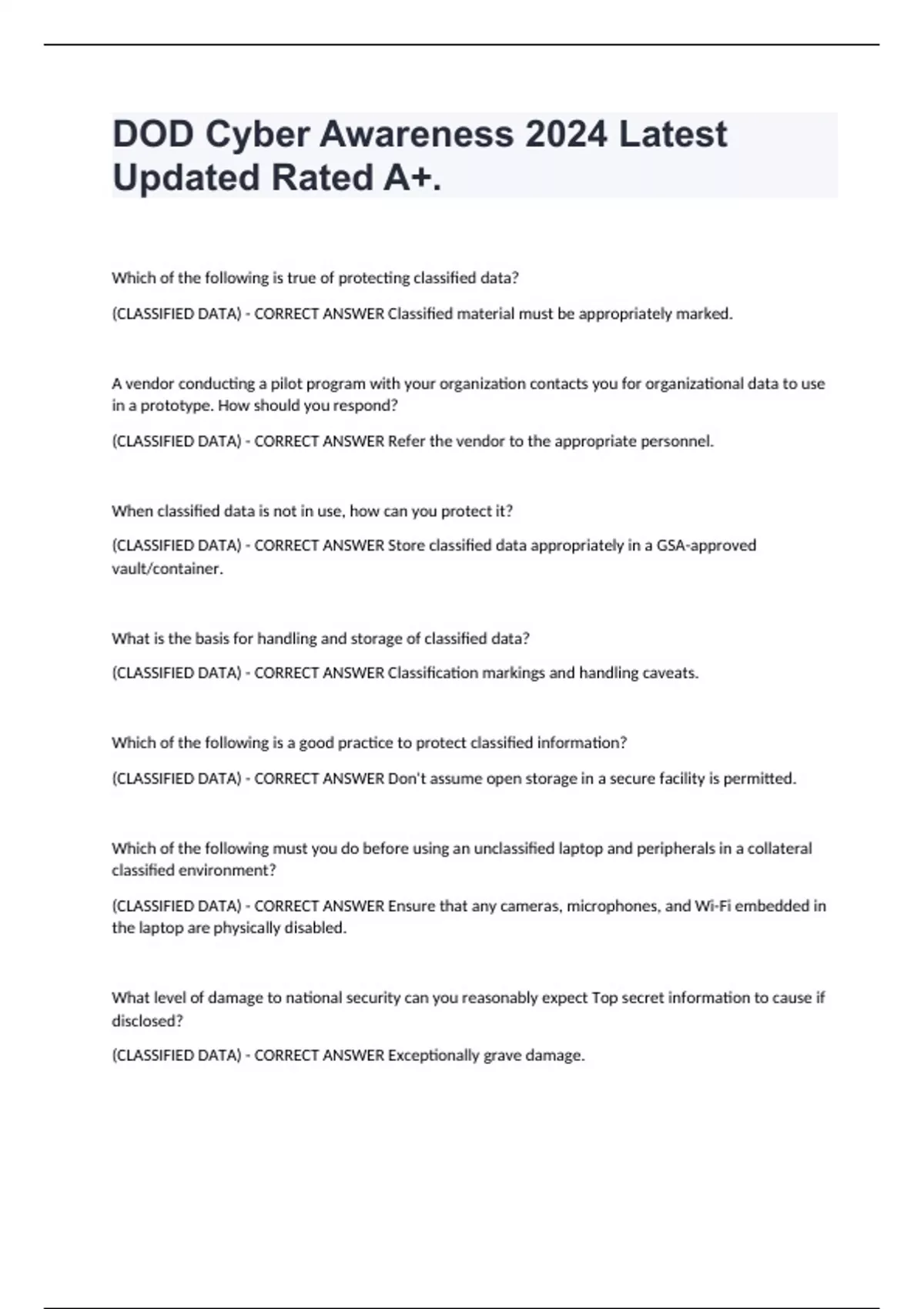 DOD Cyber Awareness 2024 Latest Updated Questions & Answers Rated A+. Which of the following is true of protecting classified data? (CLASSIFIED DATA) - CORRECT ANSWER Classified material must be appropriately marked. A vendor conducting a pilot program with your organization contacts you for organizational data to use in a prototype. How should you respond? (CLASSIFIED DATA) - CORRECT ANSWER Refer the vendor to the appropriate personnel. When classified data is not in use, how can you protect it? (CLASSIFIED DATA) - CORRECT ANSWER Store classified data appropriately in a GSA-approved vault/container. What is the basis for handling and storage of classified data? (CLASSIFIED DATA) - CORRECT ANSWER Classification markings and handling caveats. Which of the following is a good practice to protect classified information? (CLASSIFIED DATA) - CORRECT ANSWER Don't assume open storage in a secure facility is permitted. Which of the following must you do before using an unclassified laptop and peripherals in a collateral classified environment? (CLASSIFIED DATA) - CORRECT ANSWER Ensure that any cameras, microphones, and Wi-Fi embedded in the laptop are physically disabled. What level of damage to national security can you reasonably expect Top secret information to cause if disclosed? (CLASSIFIED DATA) - CORRECT ANSWER Exceptionally grave damage.