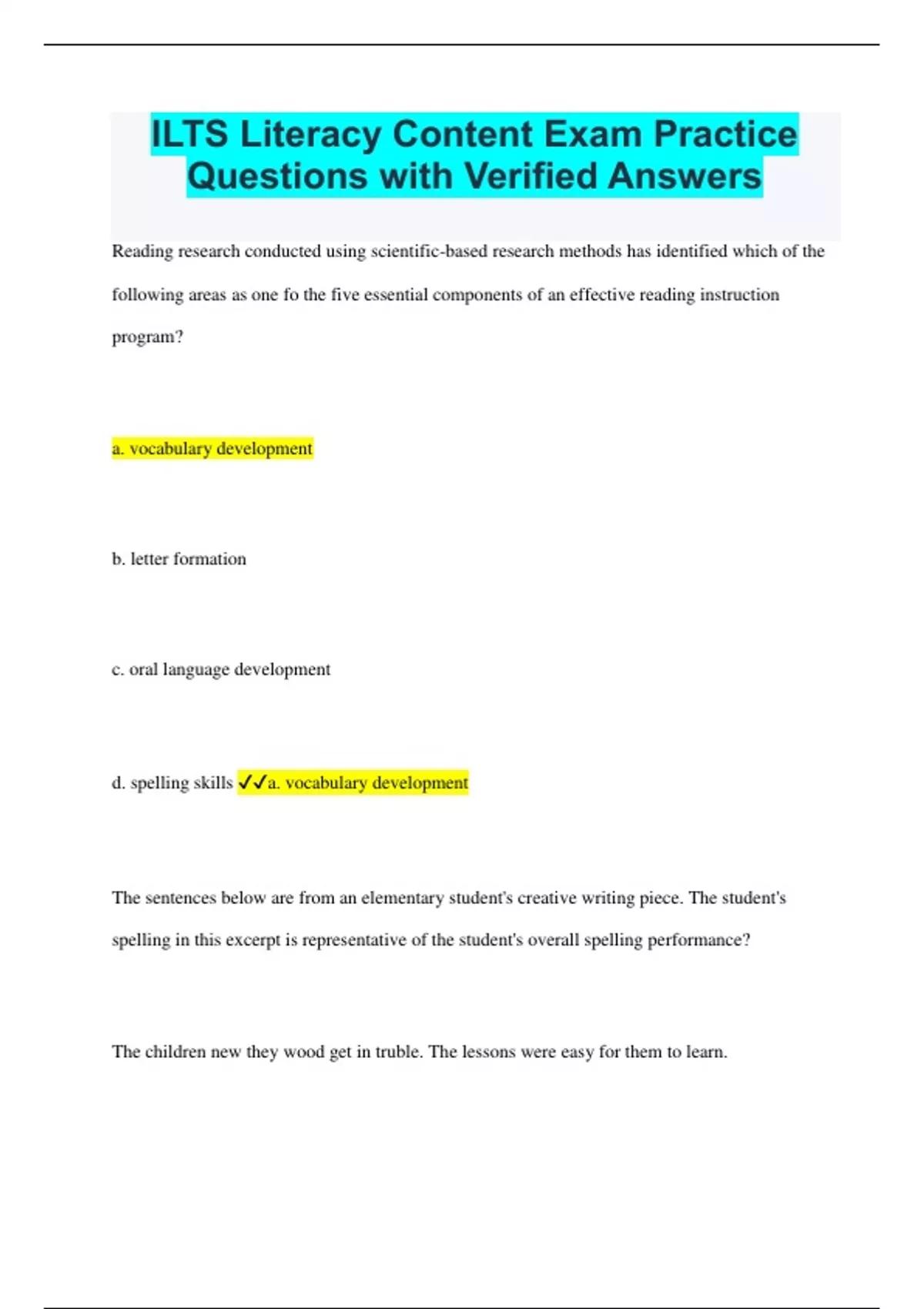 ILTS Literacy Content Exam Practice Questions with Verified Answers Reading research conducted using scientific-based research methods has identified which of the following areas as one fo the five essential components of an effective reading instruction program? a. vocabulary development b. letter formation c. oral language development d. spelling skills a. vocabulary development The sentences below are from an elementary student's creative writing piece. The student's spelling in this excerpt is representative of the student's overall spelling performance? The children new they wood get in truble. The lessons were easy for them to learn. The student's spelling is most characteristic of students in which stage of spelling development? a. semiphonetic stage b. phonetic stage c. transitional stage d. morphophonemic stage c. transitional stage Which of the following actions by an elementary teacher best demonstrates an awareness of the interconnection among literacy skills across the curriculum? a. Giving students time for rereading their content-area textbooks and discussing the material with their classmates b. Setting aside a weekly time slot for students to visit the school library and check out content- area texts the teacher has put on hold for them c. Providing students with opportunities to read and write about fiction and nonfiction texts related to concepts they are studying in content-area lessons d. Obtaining multiple copies of each content-related classroom library book so that more students have access to grade-level informational texts d. Obtaining multiple copies of each content- related classroom library book so that more students have access to grade-level informational texts An entering-level ELL has acquired grade-level literacy skills in the home language. Which of the following features of the home language would be most likely to support the transfer of basic literacy skills from the student's home language to English? a. The home language's writing system is alphabetic as is English b. The vocabulary of the home language shares some cognates with English c. The home language includes several phonemes found in English d. The syntax of the home language is similar to that of English a. The home language's writing system is alphabetic as is English Several fourth-grade students have accurate decoding skills but need work on building automaticity and improving reading rates. The teacher would like the students to read a wide range of texts to strengthen these fluency skills. Which of the following text types would be most appropriate for the teacher to provide for the students for this purpose? a. Decodable texts b. Predictable texts c. Independent-level texts d. Complex academic texts C. Independent-level texts A fifth-grade teacher regularly incorporates technology in instruction for various purposes. In an upcoming lesson, the teacher would like to promote a collaborative