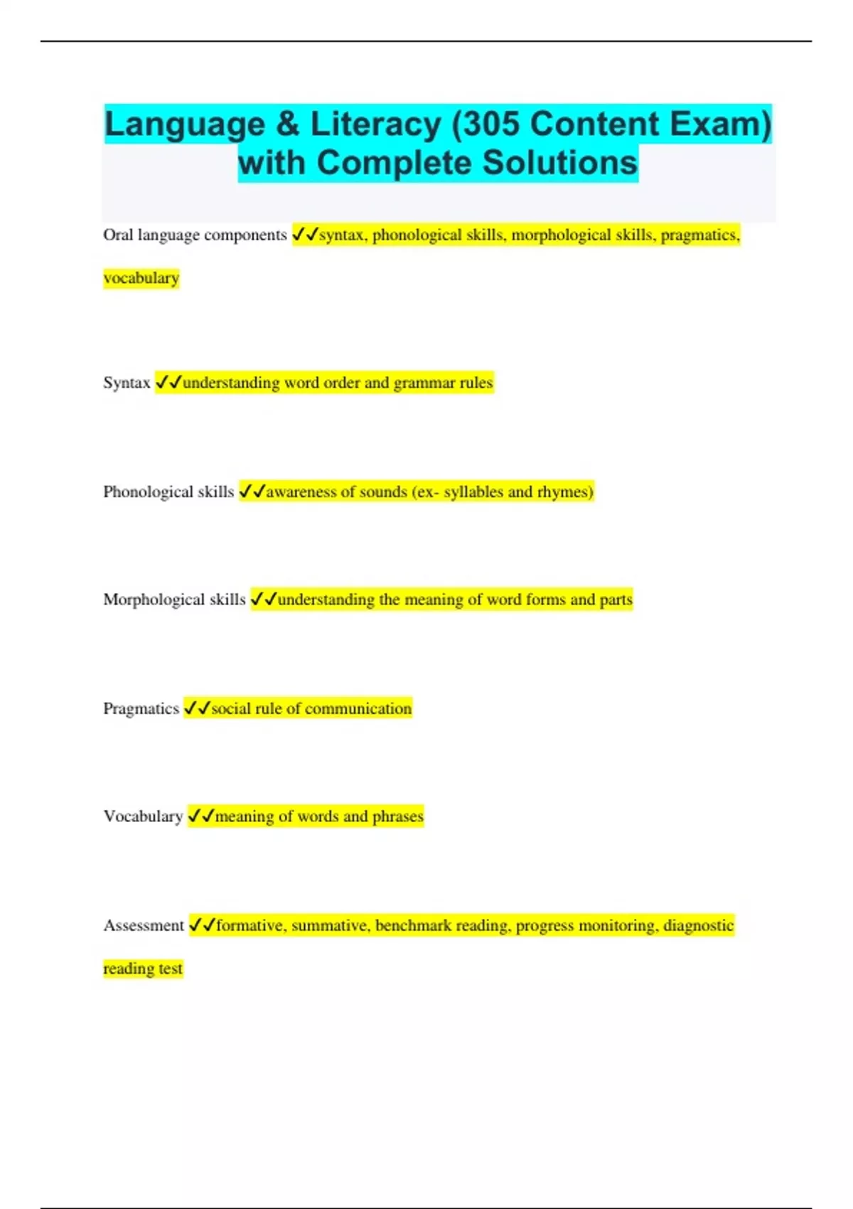 Language & Literacy (305 Content Exam) with Complete Solutions Oral language components syntax, phonological skills, morphological skills, pragmatics, vocabulary Syntax understanding word order and grammar rules Phonological skills awareness of sounds (ex- syllables and rhymes) Morphological skills understanding the meaning of word forms and parts Pragmatics social rule of communication Vocabulary meaning of words and phrases Assessment formative, summative, benchmark reading, progress monitoring, diagnostic reading test Formative informs instruction (for learning) Summative what you have learned (of learning) Benchmark reading usually given in the fall, winter, spring Progress monitoring weekly/biweekly screenings Diagnostic Reading test individual students specific areas of weakness, use the results to inform instruction, used after progress monitoring, pre-intervention step Reading levels independent, instructional, frustration Independent level 97-100% accuracy; fluent reading; 90-100% comprehension Instructional level 90-96% accuracy; somewhat fluent; 75-90% comprehension Frustration level < 90% accuracy; may/may not be fluent; comprehension low Phonological Awareness Awareness of the words, syllables, rhymes, and sounds in language. (Words in sentences) Syllables a unit of pronunciation having one vowel sound, with or without surrounding consonants. (Ze-bra; 2 syllables- 1 open syllable and 1 closed syllable) Open syllable ends with a long vowel sound spelled with one vowel letter; no consonant to close it To-tal Ri-val Bi-ble Closed syllable short vowel in syllable, vowel is followed (closed) by a consonant Com-mon But-ter Onset initial phonological unit of any word (c-at) Rime refers to the string of letters that follow, usually a vowel and final consonants (c-at) Rhyme repetition of similar sounds in two or more words. Alliteration the repetition of beginning consonant sounds in two or more neighboring words or syllables. (Sally sells seashells at the seashore)