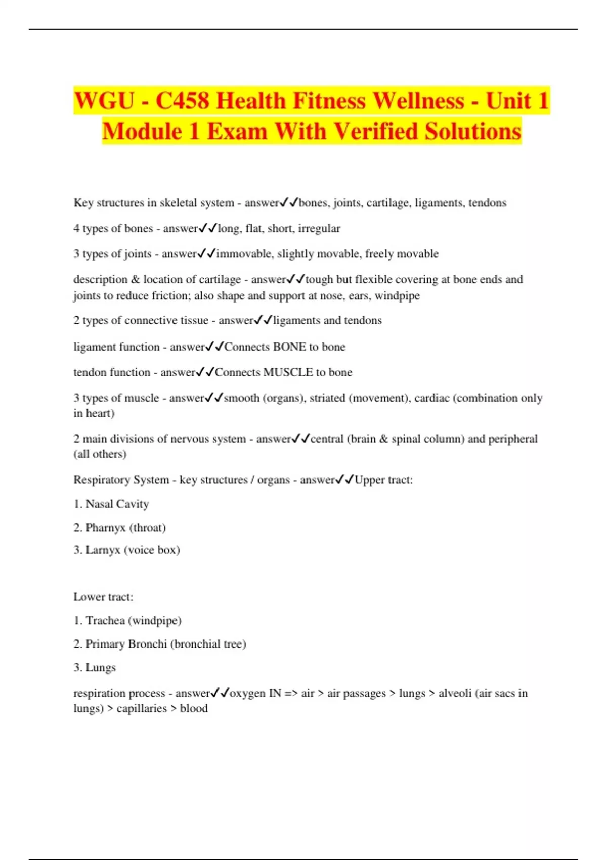 WGU - C458 Health Fitness Wellness - Unit 1 Module 1 Exam With Verified Solutions Key structures in skeletal system - answerbones, joints, cartilage, ligaments, tendons 4 types of bones - answerlong, flat, short, irregular 3 types of joints - answerimmovable, slightly movable, freely movable description & location of cartilage - answertough but flexible covering at bone ends and joints to reduce friction; also shape and support at nose, ears, windpipe 2 types of connective tissue - answerligaments and tendons ligament function - answerConnects BONE to bone tendon function - answerConnects MUSCLE to bone 3 types of muscle - answersmooth (organs), striated (movement), cardiac (combination only in heart) 2 main divisions of nervous system - answercentral (brain & spinal column) and peripheral (all others) Respiratory System - key structures / organs - answerUpper tract: 1. Nasal Cavity 2. Pharnyx (throat) 3. Larnyx (voice box) Lower tract: 1. Trachea (windpipe) 2. Primary Bronchi (bronchial tree) 3. Lungs respiration process - answeroxygen IN => air > air passages > lungs > alveoli (air sacs in lungs) > capillaries > blood