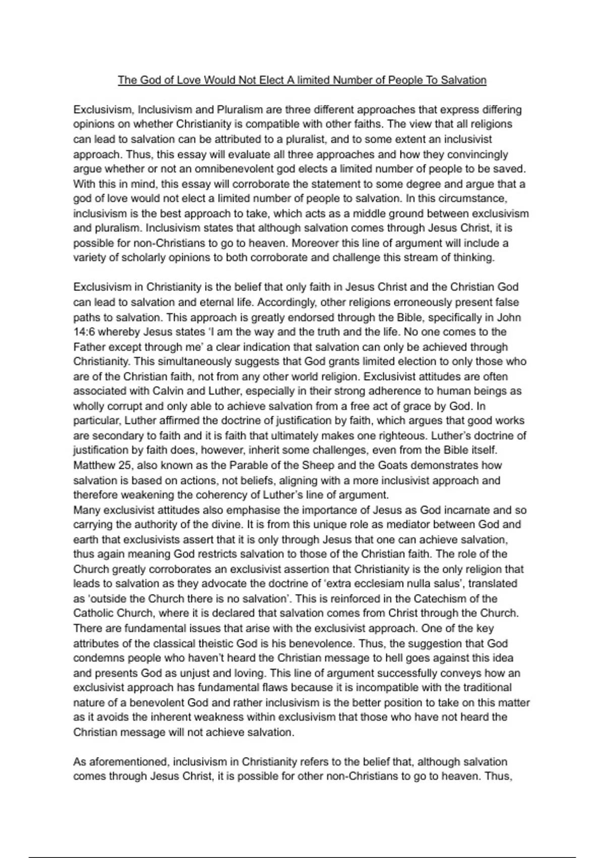 and pluralism. Inclusivism states that although salvation comes through Jesus Christ, it is