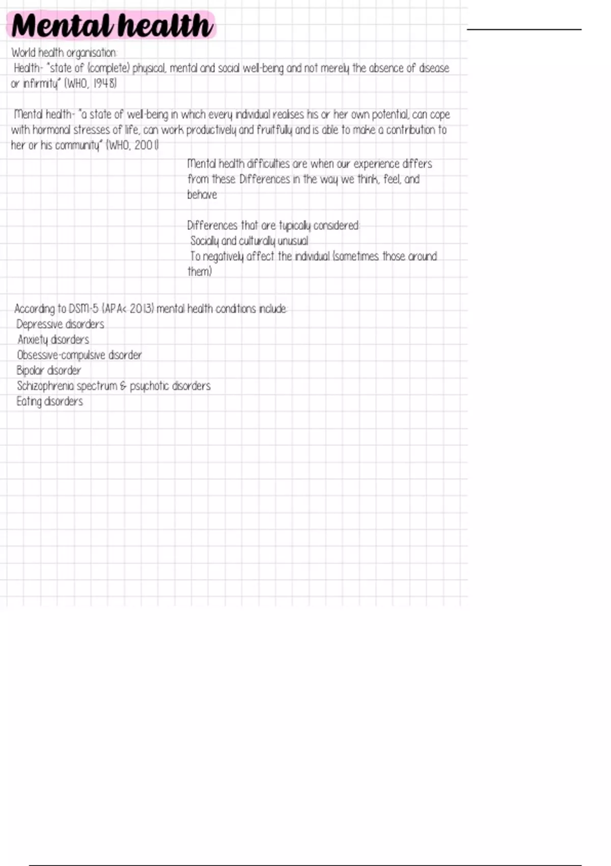 Lecture notes for 4207 module Includes topics: Talking mental health History: mental health cross time Culture: mental health across the world Mental health stigma Diagnosis vs formulation Transdiagnostic approach Biopsychosocial model Mental health interventions Strength & recovery Talking well-being Flourishing & resilience Well-being across lifespan and culture Positive clinical psychology