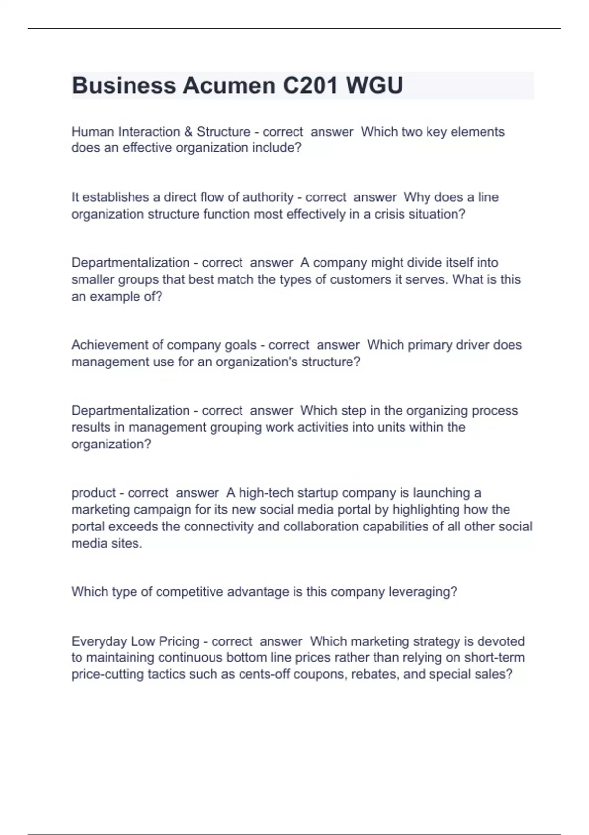 Business Acumen C201 WGU Question and answers 100% correct 2024 Human Interaction & Structure - correct answer Which two key elements does an effective organization include? It establishes a direct flow of authority - correct answer Why does a line organization structure function most effectively in a crisis situation? Departmentalization - correct answer A company might divide itself into smaller groups that best match the types of customers it serves. What is this an example of? Achievement of company goals - correct answer Which primary driver does management use for an organization's structure? Departmentalization - correct answer Which step in the organizing process results in management grouping work activities into units within the organization? product - correct answer A high-tech startup company is launching a marketing campaign for its new social media portal by highlighting how the portal exceeds the connectivity and collaboration capabilities of all other social media sites. Which type of competitive advantage is this company leveraging? Everyday Low Pricing - correct answer Which marketing strategy is devoted to maintaining continuous bottom line prices rather than relying on short-term price-cutting tactics su