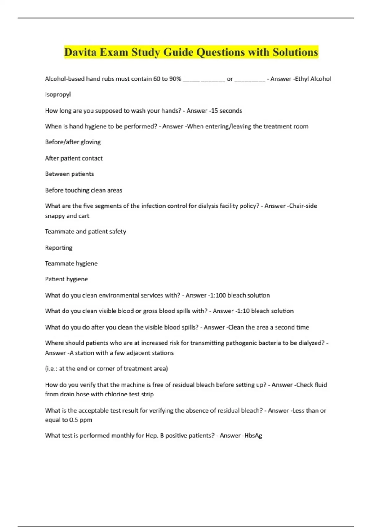 Davita Exam Study Guide Questions with Solutions Alcohol-based hand rubs must contain 60 to 90% _____ _______ or _________ - Answer -Ethyl Alcohol Isopropyl How long are you supposed to wash your hands? - Answer -15 seconds When is hand hygiene to be performed? - Answer -When entering/leaving the treatment room Before/after gloving After patient contact Between patients Before touching clean areas What are the five segments of the infection control for dialysis facility policy? - Answer -Chair-side snappy and cart Teammate and patient safety Reporting Teammate hygiene Patient hygiene What do you clean environmental services with? - Answer -1:100 bleach solution What do you clean visible blood or gross blood spills with? - Answer -1:10 bleach solution What do you do after you clean the visible blood spills? - Answer -Clean the area a second time Where should patients who are at increased risk for transmitting pathogenic bacteria to be dialyzed? - Answer -A station with a few adjacent stations (i.e.: at the end or corner of treatment area) How do you verify that the machine is free of residual bleach before setting up? - Answer -Check fluid from drain hose with chlorine test strip What is the acceptable test result for verifying the absence of residual bleach? - Answer -Less than or equal to 0.5 ppm What test is performed monthly for Hep. B positive patients? - Answer -HbsAg