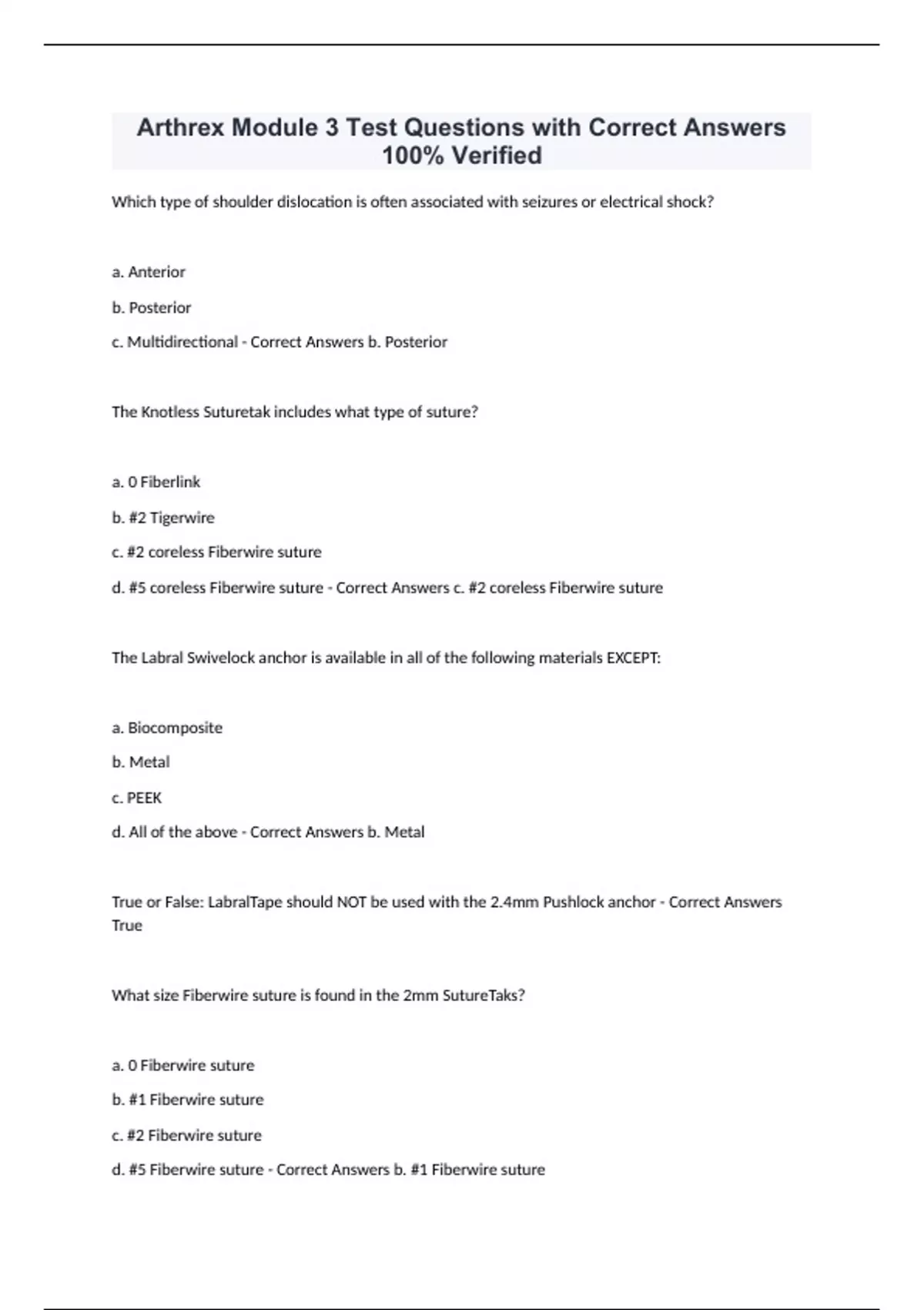 Arthrex Module 3 Test Questions with Correct Answers 100% Verified Which type of shoulder dislocation is often associated with seizures or electrical shock? a. Anterior b. Posterior c. Multidirectional - Correct Answers b. Posterior The Knotless Suturetak includes what type of suture? a. 0 Fiberlink b. #2 Tigerwire c. #2 coreless Fiberwire suture d. #5 coreless Fiberwire suture - Correct Answers c. #2 coreless Fiberwire suture The Labral Swivelock anchor is available in all of the following materials EXCEPT: a. Biocomposite b. Metal c. PEEK d. All of the above - Correct Answers b. Metal True or False: LabralTape should NOT be used with the 2.4mm Pushlock anchor - Correct Answers True What size Fiberwire suture is found in the 2mm SutureTaks? a. 0 Fiberwire suture b. #1 Fiberwire suture c. #2 Fiberwire suture d. #5 Fiberwire suture - Correct Answers b. #1 Fiberwire suture