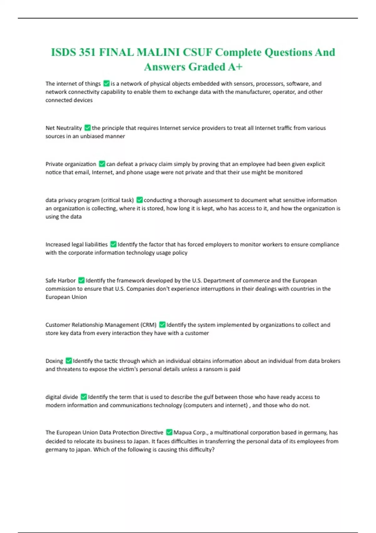 ISDS 351 FINAL MALINI CSUF Complete Questions And Answers Graded A+ ISDS 351 FINAL MALINI CSUF Complete Questions And Answers Graded A+