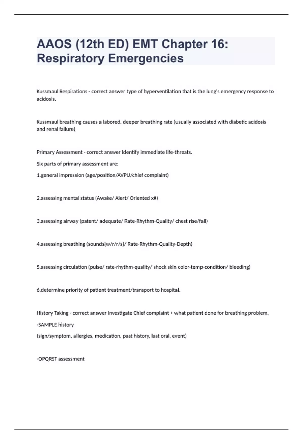 AAOS (12th ED) EMT Chapter 16 Respiratory Emergencies. Kussmaul Respirations - correct answer type of hyperventilation that is the lung's emergency response to acidosis. Kussmaul breathing causes a labored, deeper breathing rate (usually associated with diabetic acidosis and renal failure) Primary Assessment - correct answer Identify immediate life-threats. Six parts of primary assessment are: al impression (age/position/AVPU/chief complaint) sing mental status (Awake/ Alert/ Oriented x#) sing airway (patent/ adequate/ Rate-Rhythm-Quality/ chest rise/fall) sing breathing (sounds{w/r/r/s}/ Rate-Rhythm-Quality-Depth) sing circulation (pulse/ rate-rhythm-quality/ shock skin color-temp-condition/ bleeding) mine priority of patient treatment/transport to hospital. History Taking - correct answer Investigate Chief complaint + what patient done for breathing problem. -SAMPLE history (sign/symptom, allergies, medication, past history, last oral, event) -OPQRST assessment