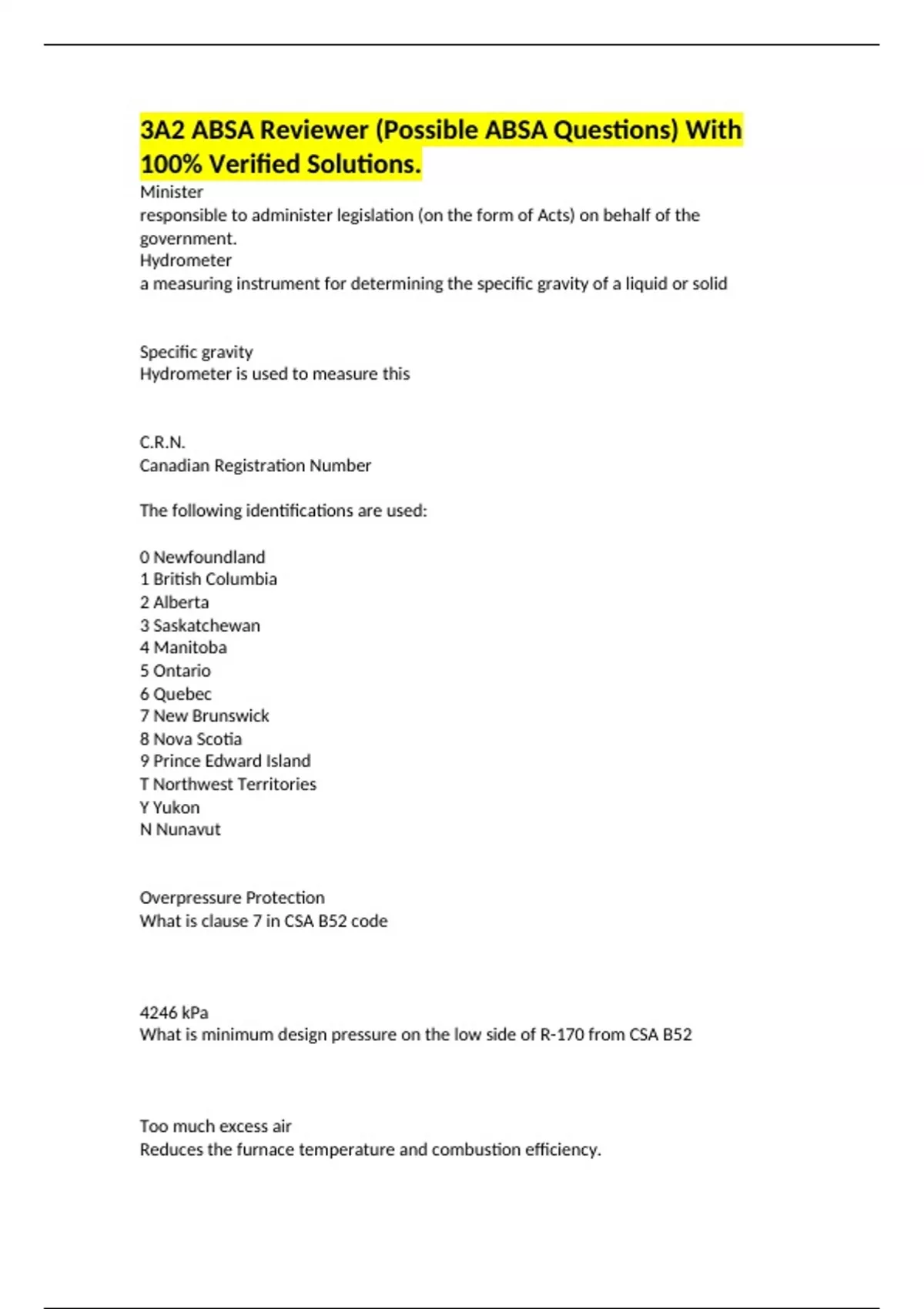 3A2 ABSA Reviewer (Possible ABSA Questions) With 100% Verified Solutions. Minister responsible to administer legislation (on the form of Acts) on behalf of the government. Hydrometer a measuring instrument for determining the specific gravity of a liquid or solid Specific gravity Hydrometer is used to measure this C.R.N. Canadian Registration Number The following identifications are used: 0 Newfoundland 1 British Columbia 2 Alberta 3 Saskatchewan 4 Manitoba 5 Ontario 6 Quebec 7 New Brunswick 8 Nova Scotia 9 Prince Edward Island T Northwest Territories Y Yukon N Nunavut Overpressure Protection What is clause 7 in CSA B52 code 4246 kPa What is minimum design pressure on the low side of R-170 from CSA B52 Too much excess air Reduces the furnace temperature and combustion efficiency. Moisture, Fixed carbon and Ash. The proximate analysis is performed on a solid fuel to determine the percentage of Dry or moisture free The ultimate analysis may be expressed: 33 700 kJ 1 kg of carbon will produce ________ of heat. kJ/m^3 In the heating value the gaseous fuel is expressed in Higher Heating Value The heating value of a fuel, determine through calorimetry or by Dulong’s formula, is called: Anthracite coal What kind of coal is hard, dense, very brittle and shiny black, with no layering: Grade 6 What grade is Bunker C oil Reaction with ammonia in the presence of a catalyst. Most effective method of reducing NOx emissions is by: High Voltage DC or Magnetic field Electrostatic precipitators the fly ash particles collect on grounded plates are removed by: Low Carbon Steel and Cupro Nickel alloy What are the most frequently used material for power piping system: 200 mm or larger What size of piping are butterfly valves normally used for: 100 mm What size of piping is threaded pipe used for: American Standard Pipe Thread Threaded connections can be classified by: Possibility of leakage is reduced Welded joints give more flexibility What is advantage of welded joints over screwed or flanged connection: below the frost line between the foot piece and barrel of the hydrant In dry barrel where is base valve is located: Minor surface flaws and misalignment of the flange faces. Why are Gaskets used in between the flange faces: steam trap A ______________ is a device that is used to discharge condensate from steam lines, separators, and other equipment without permitting steam to escape. Efficient venting of air and carbon dioxide What all steam trap provide: Liquid Expansion Trap Which trap uses a thermostatic element, which is filled with a special oil, to control the opening or closing of the trap discharge valve: The lower the K-factor, the better is the insulating The coefficient of thermal conductivity (k) represents: Calcium Silicate What kind of pipe insulation is made of lime and silica: ball valve A ___________ is ¼ turn or quarter turn. Plug Valve Which valve is also known as petcock valve: Resistance, Current, Voltage Ohm's laws refers to what: Lenz's Law The induced e.m.f is always in such a direction as to oppose the change that caused it. butterfly valve A __________ is a 90 degree turn. Thermal cutout and Fuse Link What are two parts of a time lag fuse: Safety switch a device for isolating parts of an electric circuit or for changing connections in a circuit, or system gear