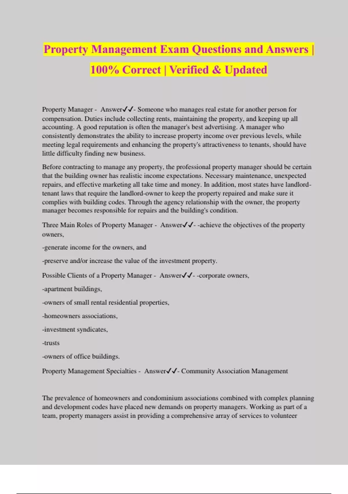 Property Management Exam Questions and Answers | 100% Correct | Verified & Updated Property Manager - Answer️️ - Someone who manages real estate for another person for compensation. Duties include collecting rents, maintaining the property, and keeping up all accounting. A good reputation is often the manager's best advertising. A manager who consistently demonstrates the ability to increase property income over previous levels, while meeting legal requirements and enhancing the property's attractiveness to tenants, should have little difficulty finding new business. Before contracting to manage any property, the professional property manager should be certain that the building owner has realistic income expectations. Necessary maintenance, unexpected repairs, and effective marketing all take time and money. In addition, most states have landlord- tenant laws that require the landlord-owner to keep the property repaired and make sure it complies with building codes. Through the agency relationship with the owner, the property manager becomes responsible for repairs and the building's condition. Three Main Roles of Property Manager - Answer️️ - -achieve the objectives of the property owners, -generate income for the owners, and -preserve and/or increase the value of the investment property. Possible Clients of a Property Manager - Answer️️ - -corporate owners, -apartment buildings, -owners of small rental residential properties, -homeowners associations, -investment syndicates, -trusts -owners of office buildings. Property Management Specialties - Answer️️ - Community Association Management The prevalence of homeowners and condominium associations combined with complex planning and development codes have placed new demands on property managers. Working as part of a team, property managers assist in providing a comprehensive array of services to volunteer boards. Many states now require at least a real estate license or an association management license for those who specialize in managing associations. Housing for Seniors Opportunities abound in managing housing for those age 55 and older, including federally assisted housing programs. In addition to marketing, managers of senior housing are often responsible for the operation of the facility, as well as housekeeping, meal service, social event planning, and medical emergency planning. When subsidized housing is involved, the property manager needs to be familiar with state and federal rules pertaining to eligibility requirements and income verification. Manufactured Homes Homes built in factories meeting HUD specifications are called manufactured homes or HUD- code homes. These homes may be placed on individually owned land, but more than a third are sited in communities. A tenant may rent only the "pad," the land on which the home is sited, or the home itself. Many communities, especially those in the sun belt states, are geared toward seniors; managers at these communities must be effective at building community spirit. Resort Housing Managing second-home and resort rentals presents specific challenges. A resort manager must be able to care for and maintain often-vacant properties and be able to attract and manage short- term tenants. Many such properties are located in high-risk areas for natural disasters such as hurricanes, so the manager must be able to prepare for an emergency as well as to work with insurance Management Agreement - Answer️️ - A contract between the owner of income property and a management firm or individual property manager that outlines the scope of the manager's authority. What a Management Agreement should include: - Answer️️ - -Description of the property. -Time period the agreement covers and specific provisio