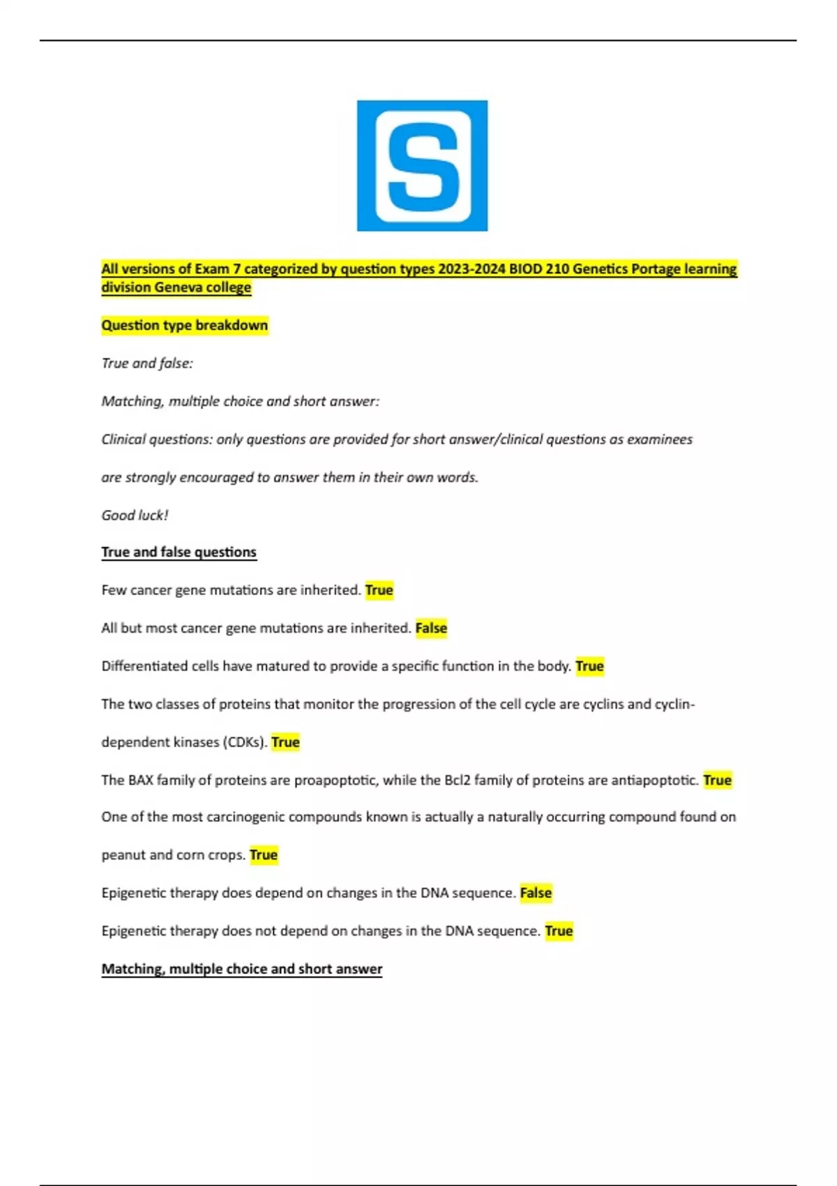 All versions of Exam 7 categorized by question types 2023-2024 BIOD 210 Genetics Portage learning