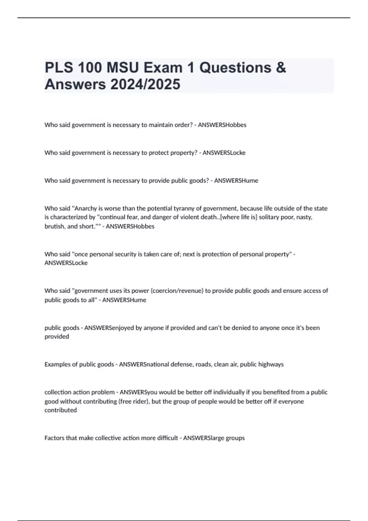 PLS 100 MSU Exam 1 Questions & Answers 2024/2025 Who said government is necessary to maintain order? - ANSWERSHobbes Who said government is necessary to protect property? - ANSWERSLocke Who said government is necessary to provide public goods? - ANSWERSHume Who said "Anarchy is worse than the potential tyranny of government, because life outside of the state is characterized by "continual fear, and danger of violent death..[where life is] solitary poor, nasty, brutish, and short."" - ANSWERSHobbes Who said "once personal security is taken care of; next is protection of personal property" - ANSWERSLocke Who said "government uses its power (coercion/revenue) to provide public goods and ensure access of public goods to all" - ANSWERSHume public goods - ANSWERSenjoyed by anyone if provided and can't be denied to anyone once it's been provided Examples of public goods - ANSWERSnational defense, roads, clean air, public highways collection action problem - ANSWERSyou would be better off individually if you benefited from a public good without contributing (free rider), but the group of people would be better off if everyone contributed Factors that make collective action more difficult - ANSWERSlarge groups