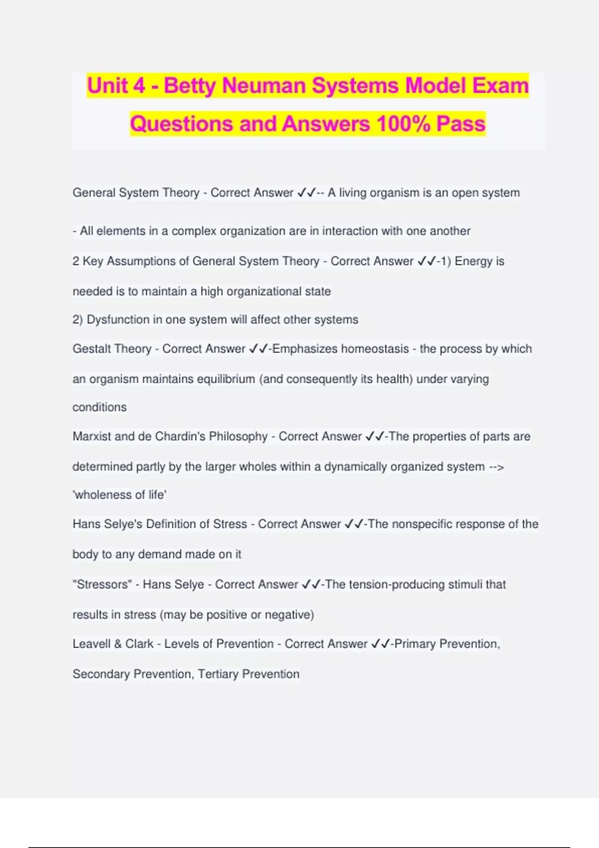 Unit 4 - Betty Neuman Systems Model Exam Questions and Answers 100% Pass General System Theory - Correct Answer ️️ -- A living organism is an open system - All elements in a complex organization are in interaction with one another 2 Key Assumptions of General System Theory - Correct Answer ️️ -1) Energy is needed is to maintain a high organizational state 2) Dysfunction in one system will affect other systems Gestalt Theory - Correct Answer ️️ -Emphasizes homeostasis - the process by which an organism maintains equilibrium (and consequently its health) under varying conditions Marxist and de Chardin's Philosophy - Correct Answer ️️ -The properties of parts are determined partly by the larger wholes within a dynamically organized system --> 'wholeness of life' Hans Selye's Definition of Stress - Correct Answer ️️ -The nonspecific response of the body to any demand made on it "Stressors" - Hans Selye - Correct Answer ️️ -The tension-producing stimuli that results in stress (may be positive or negative) Leavell & Clark - Levels of Prevention - Correct Answer ️️ -Primary Prevention, Secondary Prevention, Tertiary Prevention