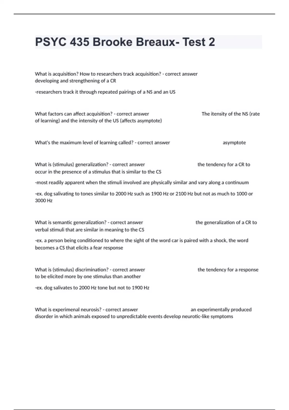 What is acquisition? How to researchers track acquisition? - correct answer developing and strengthening of a CR -researchers track it through repeated pairings of a NS and an US What factors can affect acquisition? - correct answer The itensity of the NS (rate of learning) and the intensity of the US (affects asymptote) What's the maximum level of learning called? - correct answer asymptote What is (stimulus) generalization? - correct answer the tendency for a CR to occur in the presence of a stimulus that is similar to the CS -most readily apparent when the stimuli involved are physically similar and vary along a continuum -ex. dog salivating to tones similar to 2000 Hz such as 1900 Hz or 2100 Hz but not as much to 1000 or 3000 Hz What is semantic generalization? - correct answer the generalization of a CR to verbal stimuli that are similar in meaning to the CS -ex. a person being conditioned to where the sight of the word car is paired with a shock, the word becomes a CS that elicits a fear response What is (stimulus) discrimination? - correct answer the tendency for a response to be elicited more by one stimulus than another -ex. dog salivates to 2000 Hz tone but not to 1900 Hz What is experimenal neurosis? - correct answer an experimentally produced disorder in which animals exposed to unpredictable events develop neurotic-like symptoms What is the general explanation of extinction? - correct answer a conditioned response is weakened or eliminated when the conditioned stimulus (CS) is repeatedly presented in the absence of the US -the unlearning of the connection between CS and CR What is Pavlov's explanation of extinction? - correct answer learning to inhibt the CR in the presence of the CS -the initial learning is still there and extinction just covers that up What is relearning? - correct answer a response that has been extinguished can ebe reaquired quite rapidly when the CS (or NS) is again paired with the US -doesnt take as many pairings to be conditioned again -ex. pairing the metromone with food, it doesnt take as long for the dog to begin salivation to the sound of the metronome in the absence of food What is spotaneous recovery? - correct answer the reappearance of a CR to an "NS" following a rest period after extinction -doesn't last forever and each time the response is recovered it is weaker and is extinguished more quickly than before -ex. a dog-phobic child spending several hours with a dog, the fear may seem to be eliminated but the fear may partially be recovered when the child sees a dog again What are Pavlov's pedictions? - correct answer 1.Resemblance of Rs 2.Strength of Rs 3.Directionality 4.Temporal Contiguity What is Resemblance of Rs? - correct answer the CR and UR should strongly resemble one another but the CR is weaker than UR What is Strength of Rs? - correct answer will depend on the strength of a stimulus What is Directionality? - correct answer NS before US is likely to result in conditioning -US before NS is less likely to result in condtioning What is Temporal Conditioning? - correct answer shorter delay, more likely form association What is higher order conditioning? - correct answer a stimulus that is associated with a CS can also become a CS How does higher order conditioning differ from basic CC? - correct answer What is sensory preconditioning? - correct answer when a NS previously associate with a CS also becomes a CS What is US revaluation inflation? - correct answer US is presented at an increased level of intensity after conditioning, resulting in an increase in the CR What is US revaluation deflation? - correct answer US is presented at a decreased level of intensity after conditioning, resulting in a decrease in the CR Here is a scenario: Timmy hosted a party once where his dad dressed up as a clown, painted faces and made balloon animals. That night Timmy and his friends watched the movie IT and became very fearful of clowns because of it. In the morning, Timmy's dad comes to tell everyone that he has bought donuts and chocolate milk for breakfast. When he enters the room, all the boys turn to look at him and scream. Is this an example of high-order conditioning, sensory pre-conditioning, US revaluation - inflation, or US revaluation - deflation? - correct answer sensory pre-conditioning Here is a scenario: Mary used to love dogs. Then one day she gets bit by her brother's dog. Because of generalization, she now fears not just her brother's dog, but other dogs as well. The other day, Mary noticed that the park by school is now a place where people like to bring their dogs to socialize. Mary's friend asked her to meet her after school by th