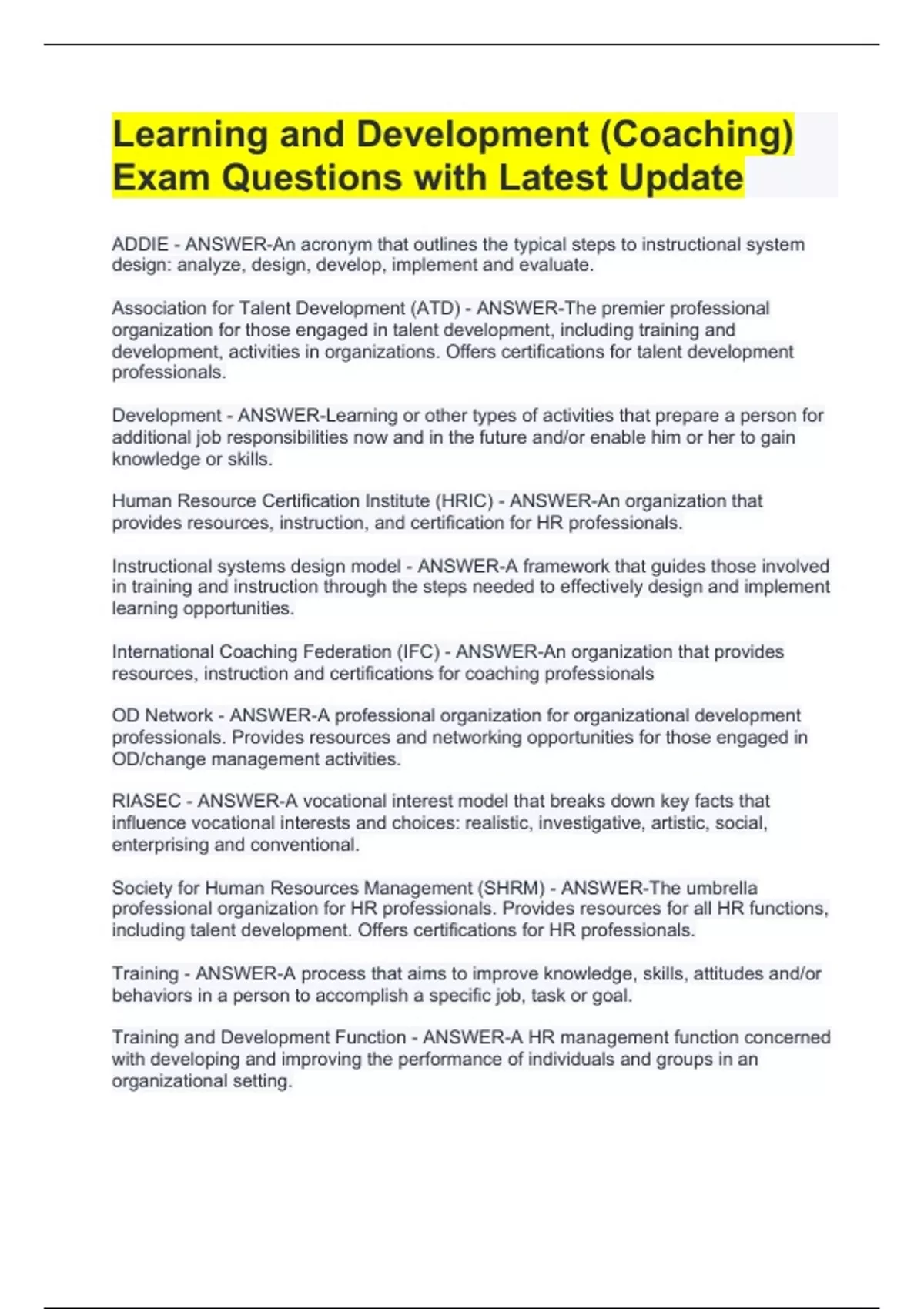 Learning and Development (Coaching) Exam Questions with Latest Update