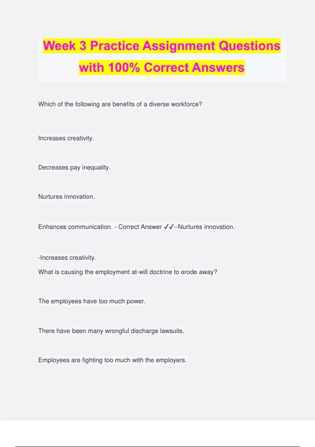 Week 3 Practice Assignment Questions with 100% Correct Answers Which of the following are benefits of a diverse workforce? Increases creativity. Decreases pay inequality. Nurtures innovation. Enhances communication. - Correct Answer ️️ --Nurtures innovation. -Increases creativity. What is causing the employment at-will doctrine to erode away? The employees have too much power. There have been many wrongful discharge lawsuits. Employees are fighting too much with the employers. The employers have too much power. - Correct Answer ️️ -There have been many wrongful discharge lawsuits. Affirmative action is defined as _________. - Correct Answer ️️ -Action taken by an employer to overcome discriminatory effects of past or current practices The principle of employment-at-will states that employers can terminate employees ______________. - Correct Answer ️️ -For any (nondiscriminatory) reason Workers of what age are now protected by the ADEA? - Correct Answer ️️ -Ages 40 and above Birthplace is an example of what protected class? - Correct Answer ️️ -national origin Modern employment at-will guarantees all of the following except _________. - Correct Answer ️️ -That employers can fire their employees for any reason How can training help organizations be better prepared for rapid development and expansion? - Correct Answer ️️ -They can build transferrable skills. Which of the following is true of training and development? When setting up training programs, "what" questions are the primary criteria to consider. The largest variety of training methods and media possible should be used to ensure that employees get a wide range of opportunities. Even with the external changes occurring in our global society, the notion of training and development has stayed the same. The proper use of reinforcers before and after training can improve the effectiveness of the training. - Correct Answer ️️ - The assessment phase provides all the following information about employee training except _________. - Correct Answer ️️ -How much the training will cost. What is a contract plan when it comes to the evaluation phase of a training or development program? The plan written up by the trainer and given to participants at the beginning of the training to sign and verify they will impl