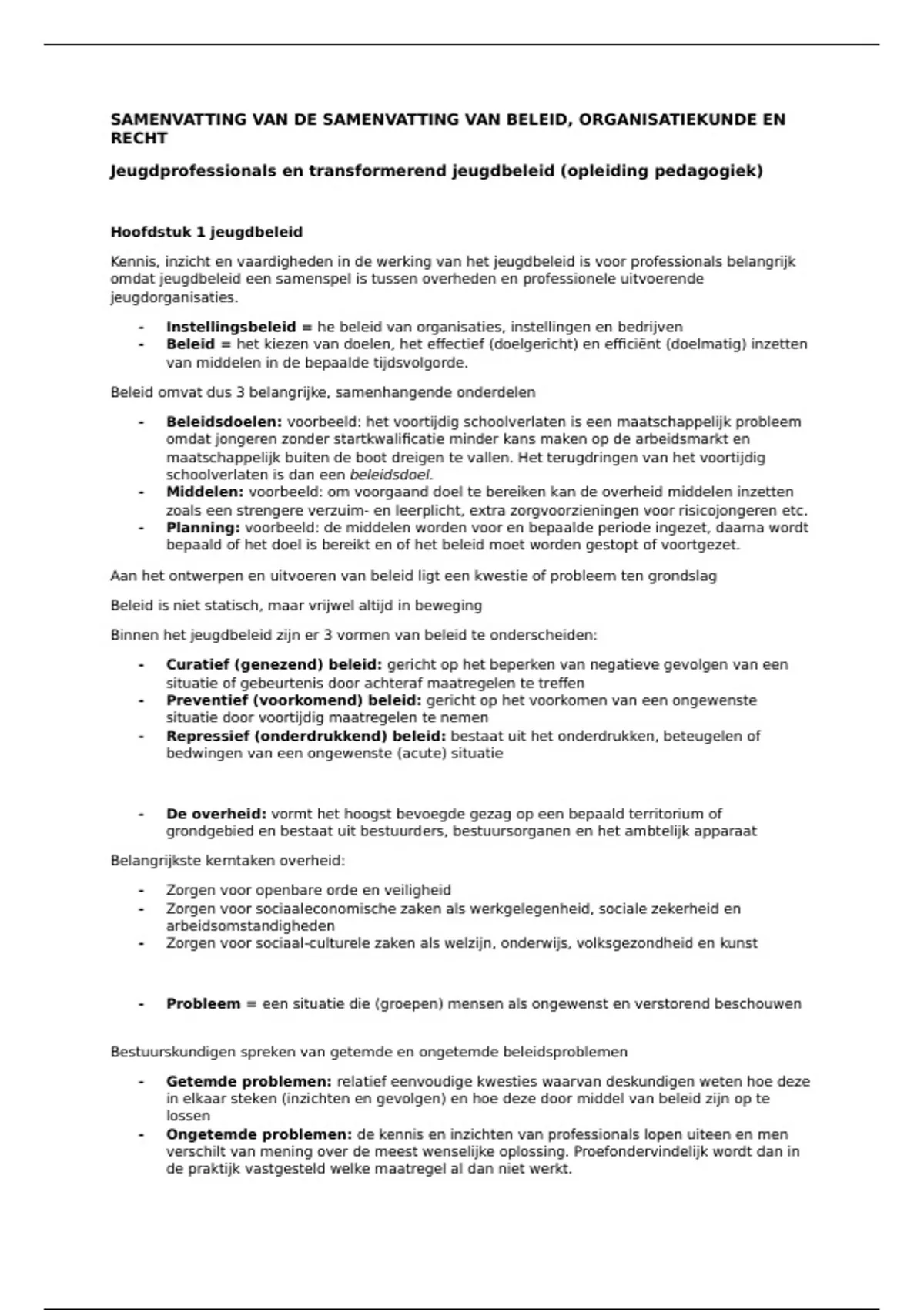 SAMENVATTING VAN DE SAMENVATTING VAN BELEID, ORGANISATIEKUNDE EN