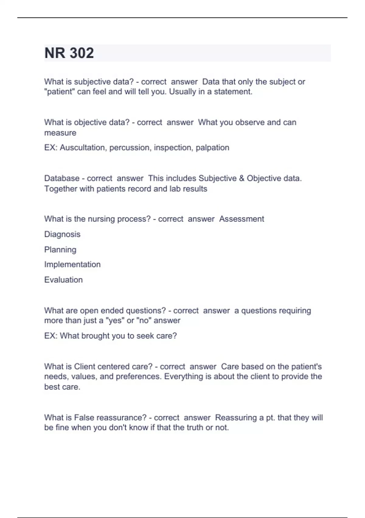 NR 302 NR 302 Chamberlain College Nursing - Question and answers already passed 2024 What is subjective data? - correct answer Data that only the subject or "patient" can feel and will tell you. Usually in a statement. What is objective data? - correct answer What you observe and can measure EX: Auscultation, percussion, inspection, palpation Database - correct answer This includes Subjective & Objective data. Together with patients record and lab results What is the nursing process? - correct answer Assessment Diagnosis Planning Implementation Evaluation What are open ended questions? - correct answer a questions requiring more than just a "yes" or "no" answer EX: What