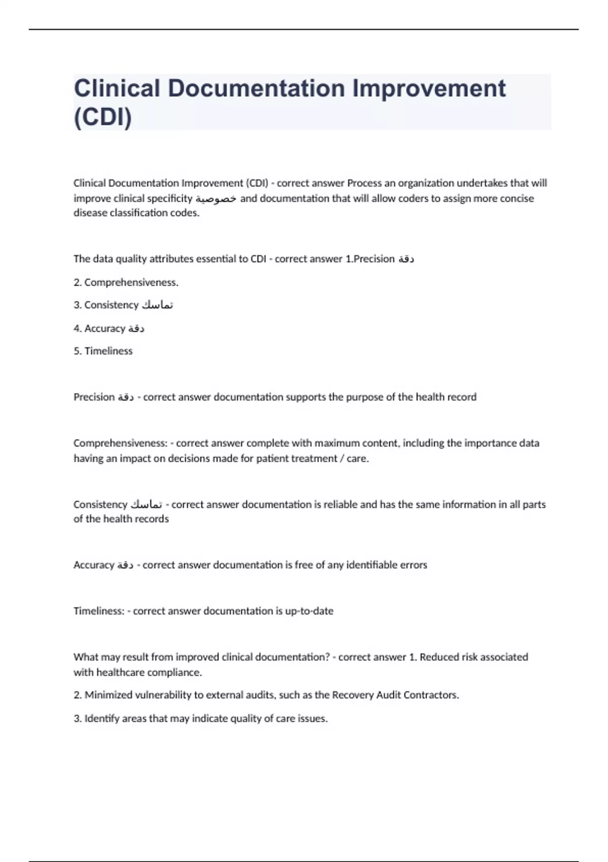 Clinical Documentation Improvement (CDI) Review Practice Questions 2024. Clinical Documentation Improvement (CDI) - correct answer Process an organization undertakes that will improve clinical specificity خصوصية and documentation that will allow coders to assign more concise disease classification codes. The data quality attributes essential to CDI - correct answer 1.Precision دقة 2. Comprehensiveness. 3. Consistency تماسك 4. Accuracy دقة 5. Timeliness Precision دقة - correct answer documentation supports the purpose of the health record Comprehensiveness: - correct answer complete with maximum content, including the importance data having an impact on decisions made for patient treatment / care. Consistency تماسك - correct answer documentation is reliable and has the same information in all parts of the health records Accuracy دقة - correct answer documentation is free of any identifiable errors Timeliness: - correct answer documentation is up-to-date What may result from improved clinical documentation? - correct answer 1. Reduced risk associated with healthcare compliance. 2. Minimized vulnerability to external audits, such as the Recovery Audit Contractors. 3. Identify areas that may indicate quality of care issues. 4. Improve reporting for quality measures, present of admission indicator, pay for performance programs, value-based purchasing, data used for decision-making in reimbursement methodologies, and better information for reporting the patient care provided. The core designated clinical documentation set for coding compliance in the acute care inpatient health record: - correct answer 1. Attending physician documentation. 2. Other provider documentation. 3. Diagnostic test results, Pathology reports Attending physician documentation: - correct answer H&P, problem list, progress notes, orders, operative reports, discharge summary.