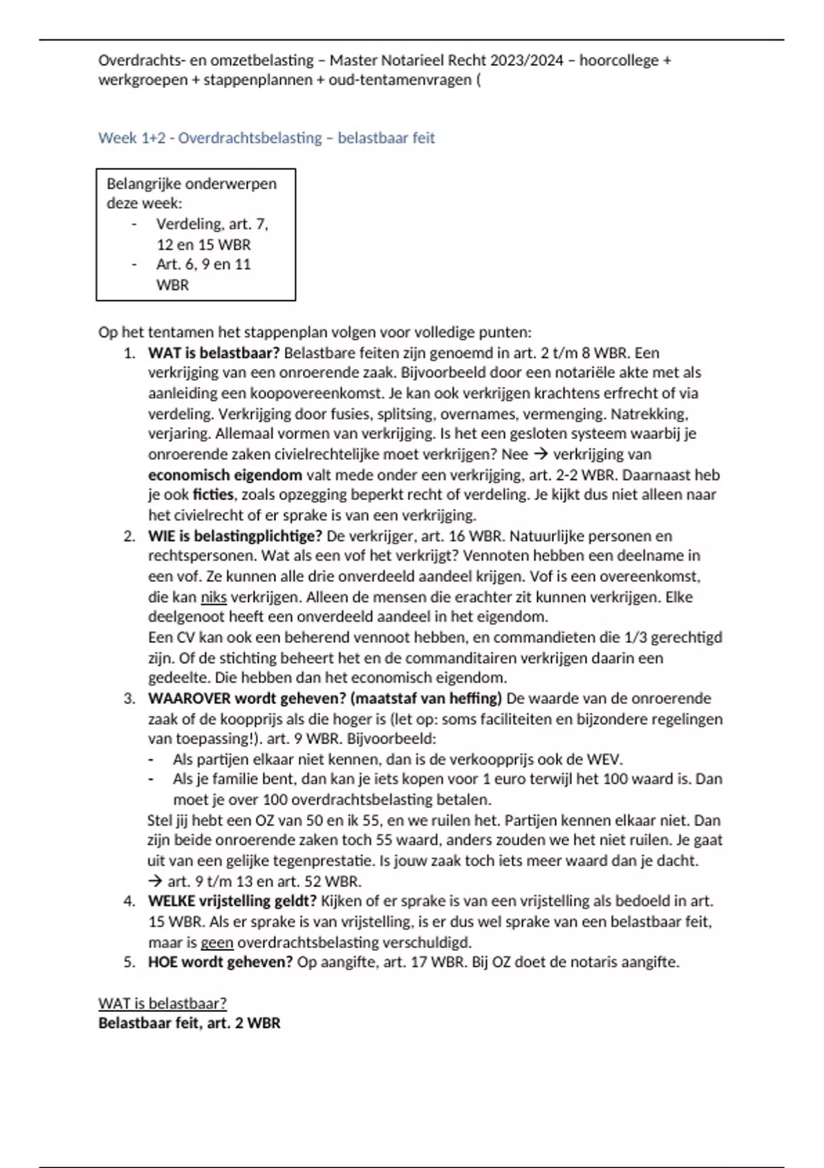 Voor het behalen van het vak Overdrachts- en omzetbelasting van de master Notarieel recht aan de Vrije Universiteit (VU), heb je alleen DIT document nodig! Je kunt hier van alle weken stof, hoorcollege en werkgroepaantekeningen vinden. Ook kun je handige stappenplannen vinden voor het tentamen, met relevante wetsartikelen én arresten. Daarnaast kun je per week een tentamenvraag uit een oud tentamen mét bijbehorende antwoorden vinden. Met dit document ben je helemaal klaargestoomd voor het tentamen! Zelf heb ik een 8,5 hiermee behaald!