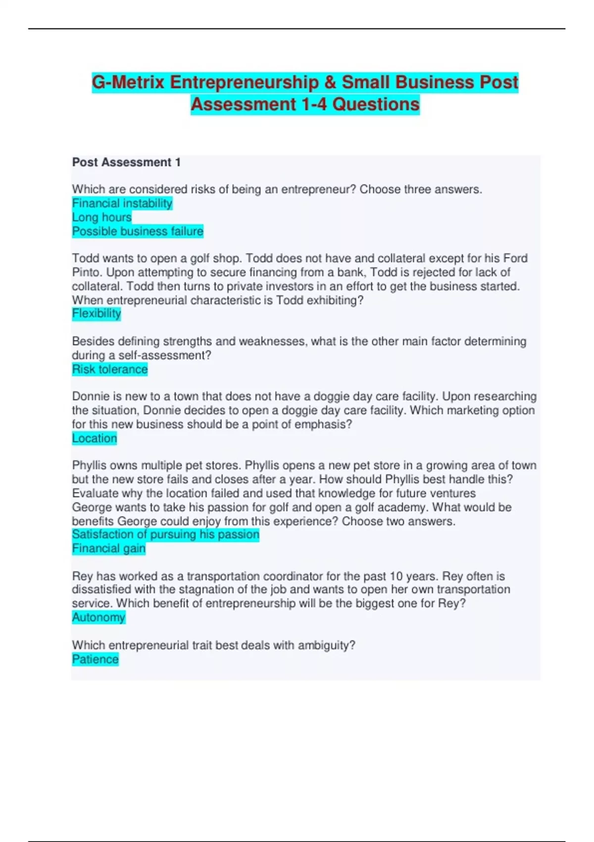 G-Metrix Entrepreneurship & Small Business Post Assessment 1-4 Questions (Answered)